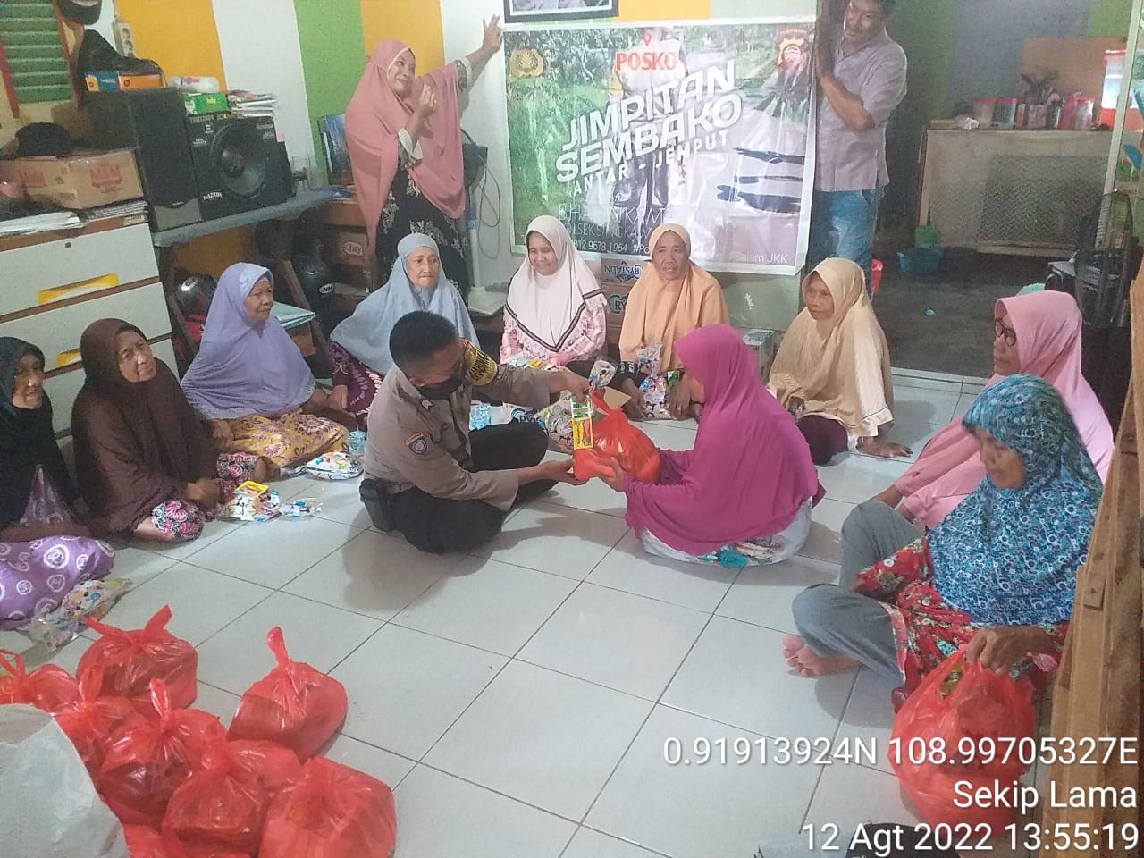 Singkawang – Bhabinkamtibmas Polsek Singkawang Tengah yang bertugas di Kelurahan Sekip Lama Brigpol Andi Chatibi, S.IP bersama, Kasi Trantif Kelurahan Sekip Lama, Mahasiswa Poltekes Pontianak dan Tim Relawan Salurkan bantuan sosial dari Program Jimpitan Sembako , untuk warga kurang mampu di Kelurahan Sekip Lama, Kecamatan Singkawang Tengah, Jumat 12 Agustus 2022.