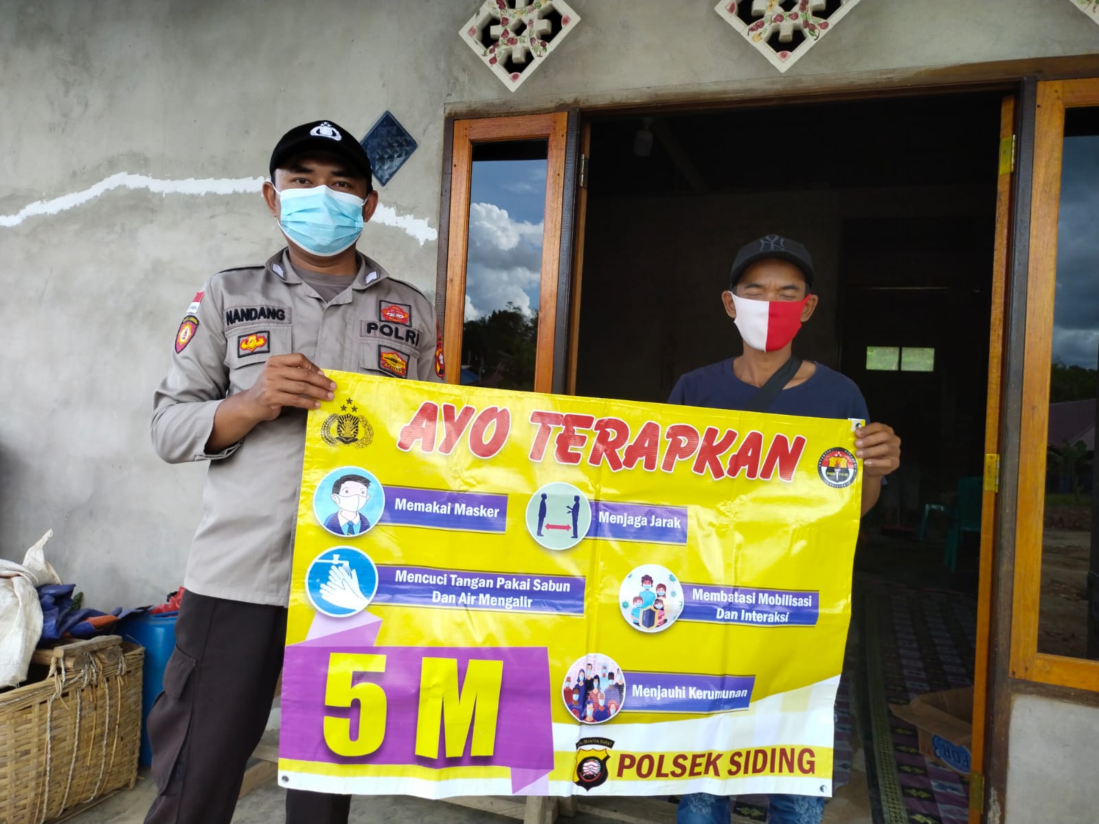 Dalam pencegahan meluasnya penularan covid-19, Personil Polsek Siding, Polres Bengkayang, Polda Kalbar, Bripka Nandang Prasojo melaksanakan sosialisasi protokol kesehatan melalui spanduk himbauan guna mencegah penyebaran covid-19 di Kecamatan Siding Kabupaten Bengkayang Provinsi Kalbar, Rabu (05/01/2022).