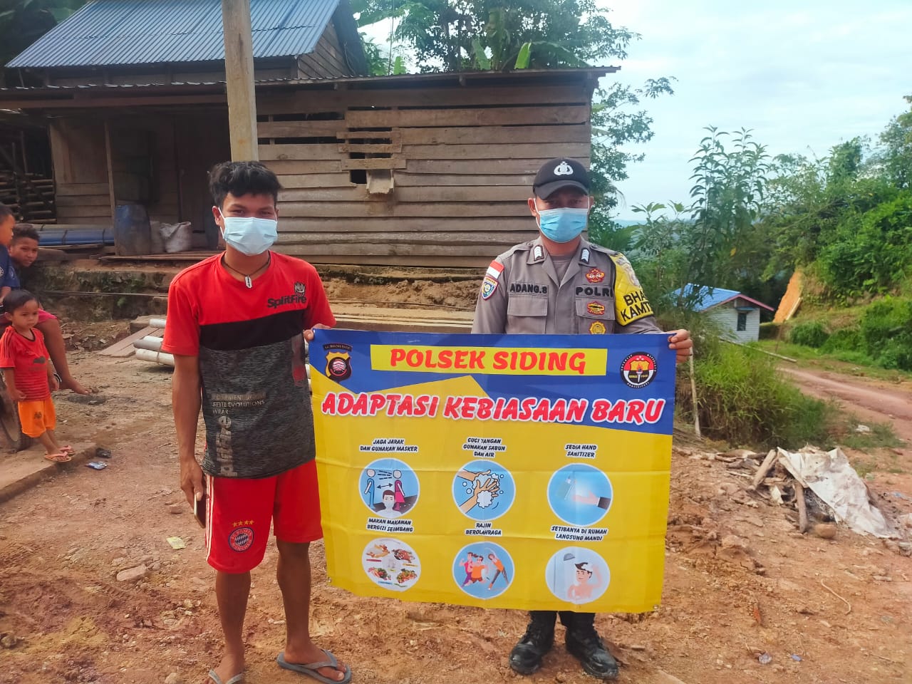 Dalam pencegahan meluasnya penularan covid-19, Personil Polsek Siding, Polres Bengkayang, Polda Kalbar, Bripka Adang Sugiarto melaksanakan sosialisasi protokol kesehatan melalui spanduk himbauan guna mencegah penyebaran covid-19 di Kecamatan Siding Kabupaten Bengkayang Provinsi Kalbar. Kamis (14/10/2021).