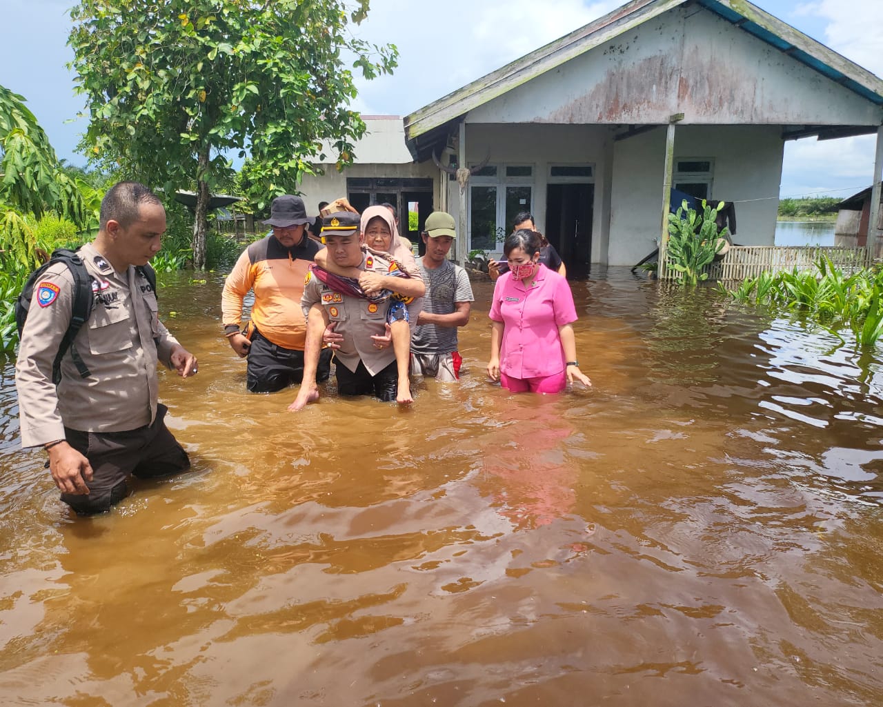Dalam kesempatan yang sama Kapolsek Matan Hilir Selatan IPDA Meinardus Yudiansyah S.H., M.H.dengan anggota dan Bhayangkari serta Forcopimcam juga membantu seoarang nenek yang akan kembali ke rumah melintasi banjir dengan cara digendong.