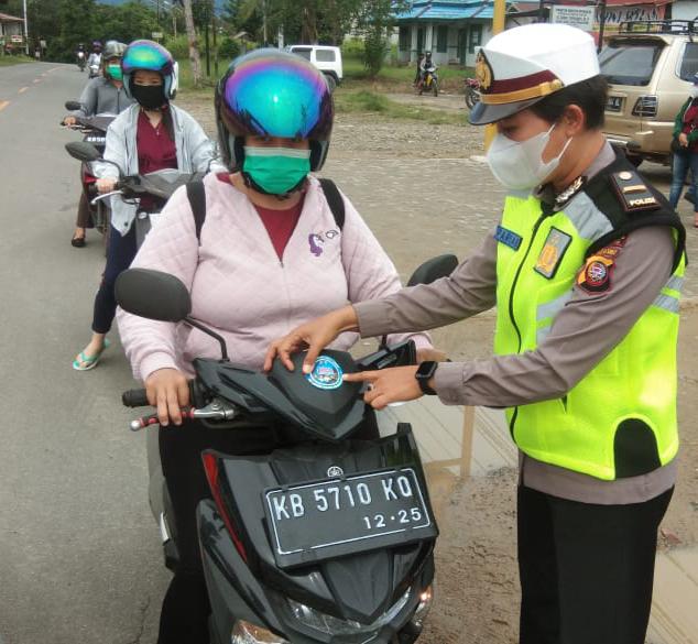 Selain memberikan masker secara gratis, pihaknya juga melaksanakan penempelan stiker bertuliskan ayo pakai masker dan patuhi Prokes Covid 19 kepada para pengguna jalan yang melintas di jalan sanggau ledo Bengkayang.