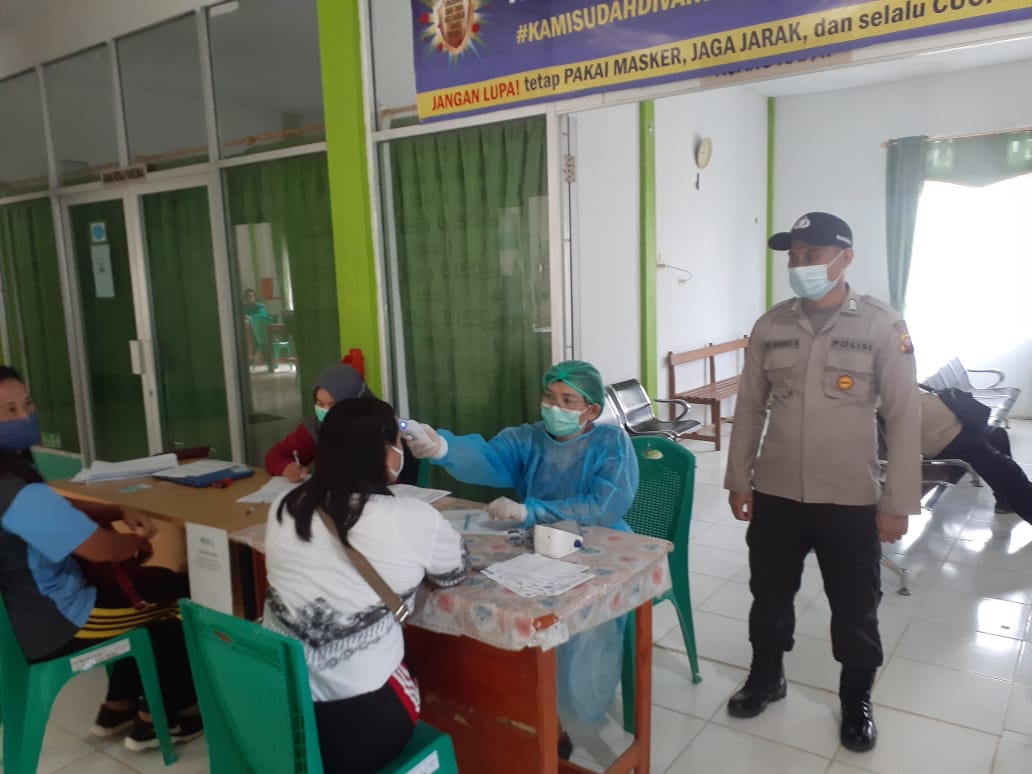 Polres Bengkayang, anggota Polsek Ledo Melalui piket Spkt melakukan pengamanan dan monitoring pada saat pelaksanaan vaksinasi covid-19 tahap pertama bagi Tenaga Guru di Puskesmas Ledo. Jumat/28/Mei/2021.