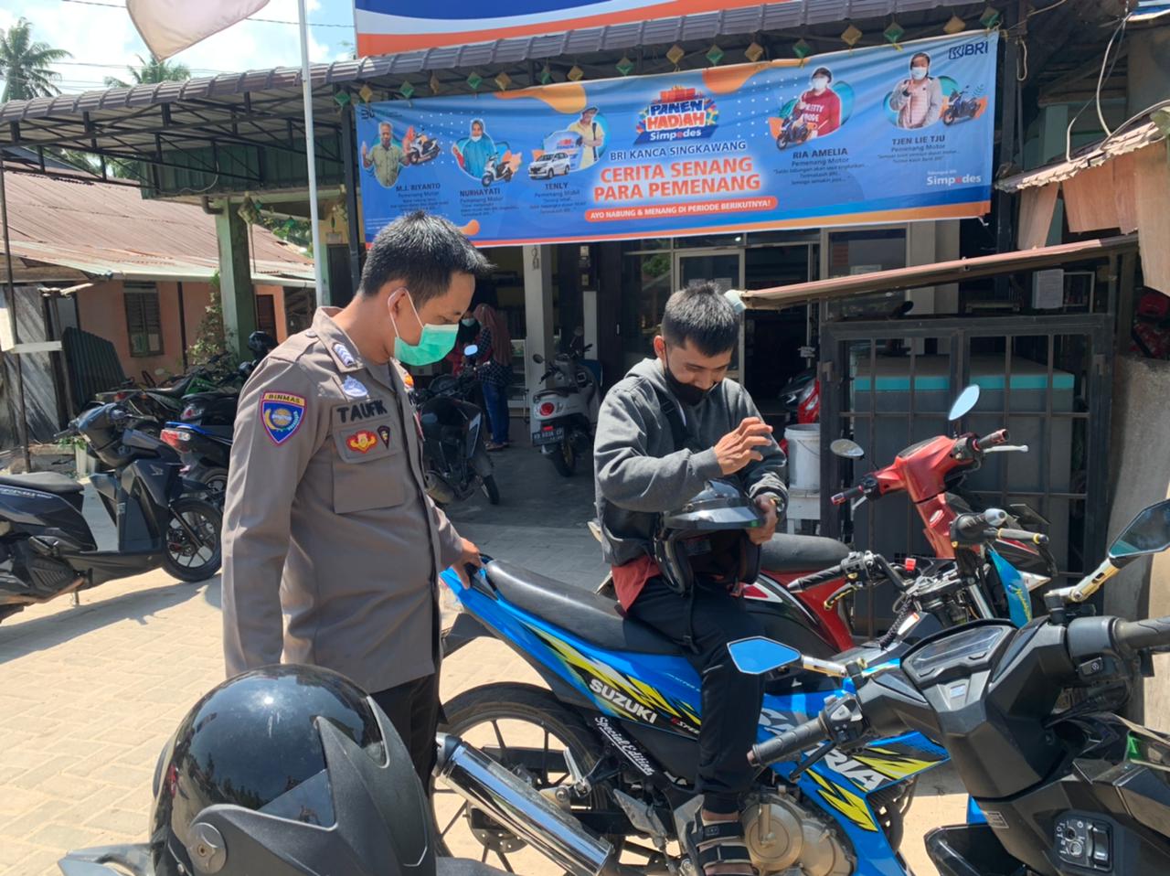 “Tentunya himbauan pemerintah terkait penggunakann masker adalah cara yang paling utama dalam mempertahankan diri dari terpaparnya virus covid, oleh karena itu saya mengimbau kepada rekan rekan warga yang ada di kawasan Kec.Sungai Raya Kepulauan untuk disiplin dan wajib menggunakan masker saat kegiatan sehari hari,” ujar Bripka Taufik