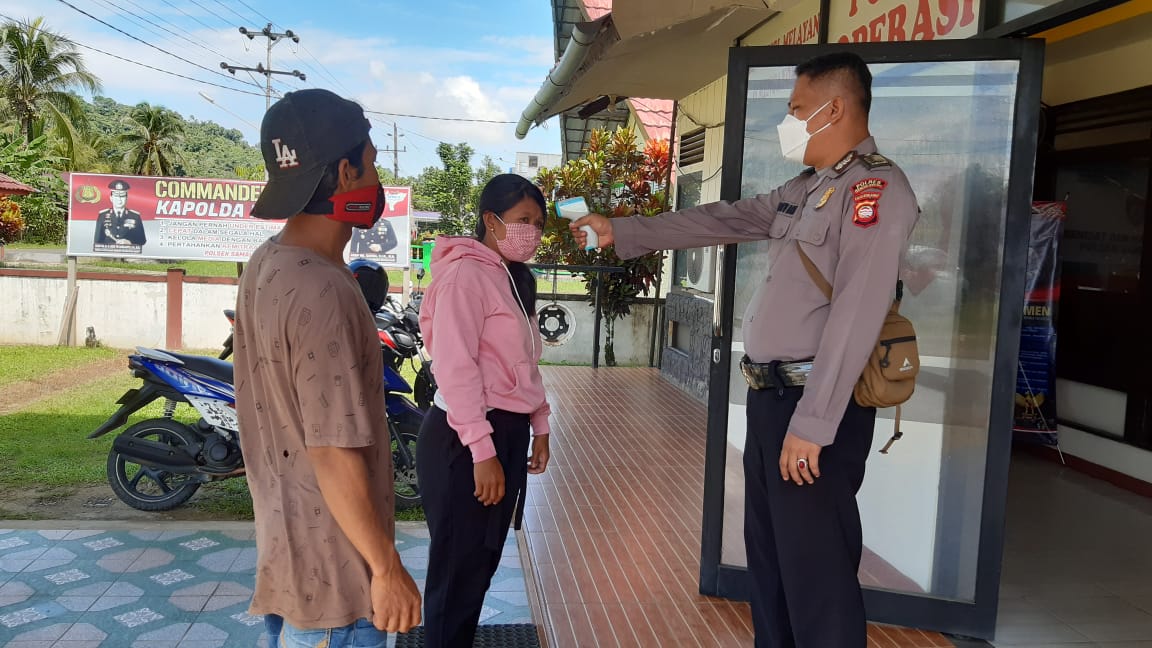 Sebelum memasuki Polsek, warga dipastikan menggunakan masker kemudian mencuci tangan ditempat yang sudah disediakan setelah itu di cek suhu tubuhnya dengan alat thermogun.