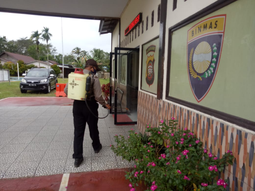 Anggota Polsek Bengkayang jajaran Polres Bengkayang, Polda Kalbar secara rutin setiap hari menyemprotkan cairan disinfektan di mako Polsek Bengkayang.