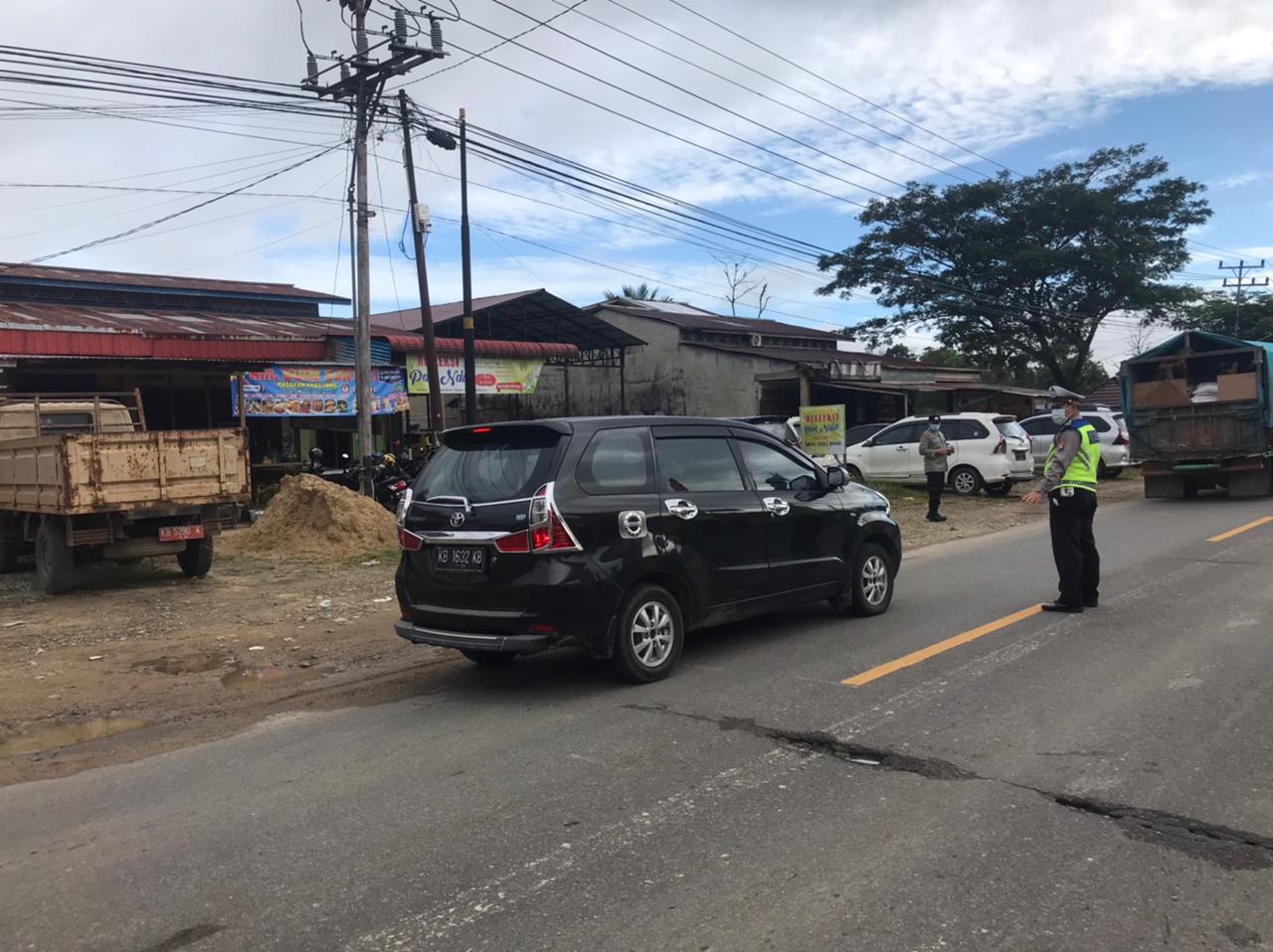 Aipda Agustiman dan Aipda Ruslan melaksanakan pengaturan lalu lintas di jalan Sanggau Ledo Bengkayang dengan tujuan untuk menjaga keselamatan masyarakat yg menyebrang jln dari kecelakaan lalu lintas.