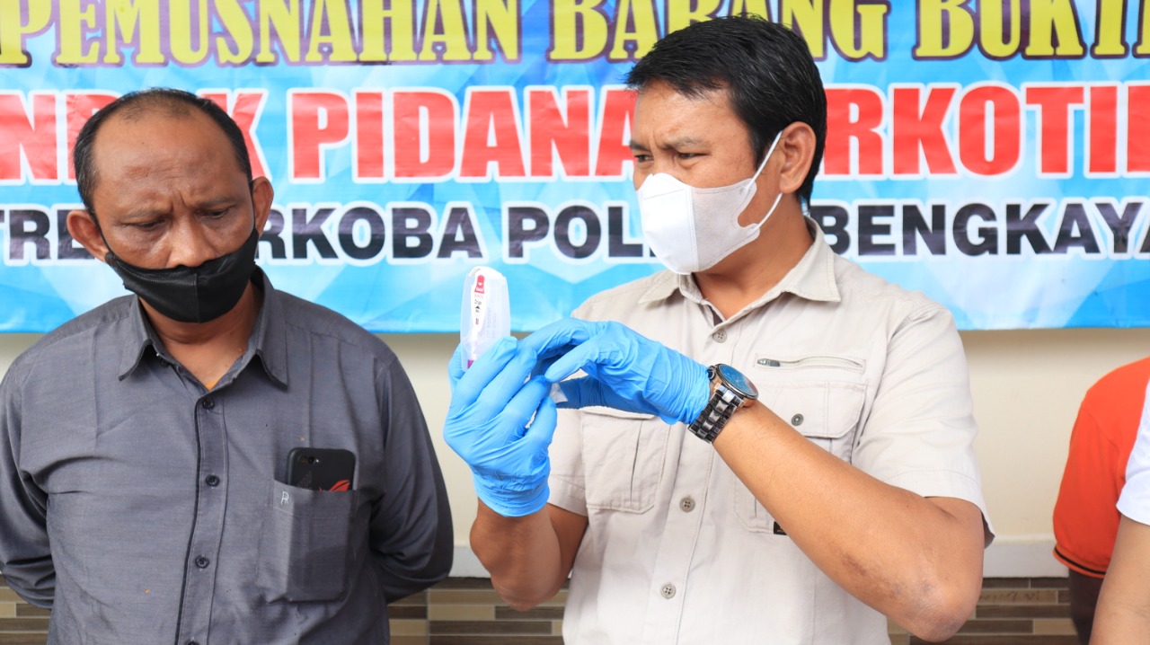“Pemusnahan dilakukan setelah dilakukan penyisihan BB untuk pembuktian perkara seberat 2 gram dan 0, 01 untuk pengujian sampel barang bukti secara laboratorium di BPOM Pontianak”, kata IPTU Maju Siregar.