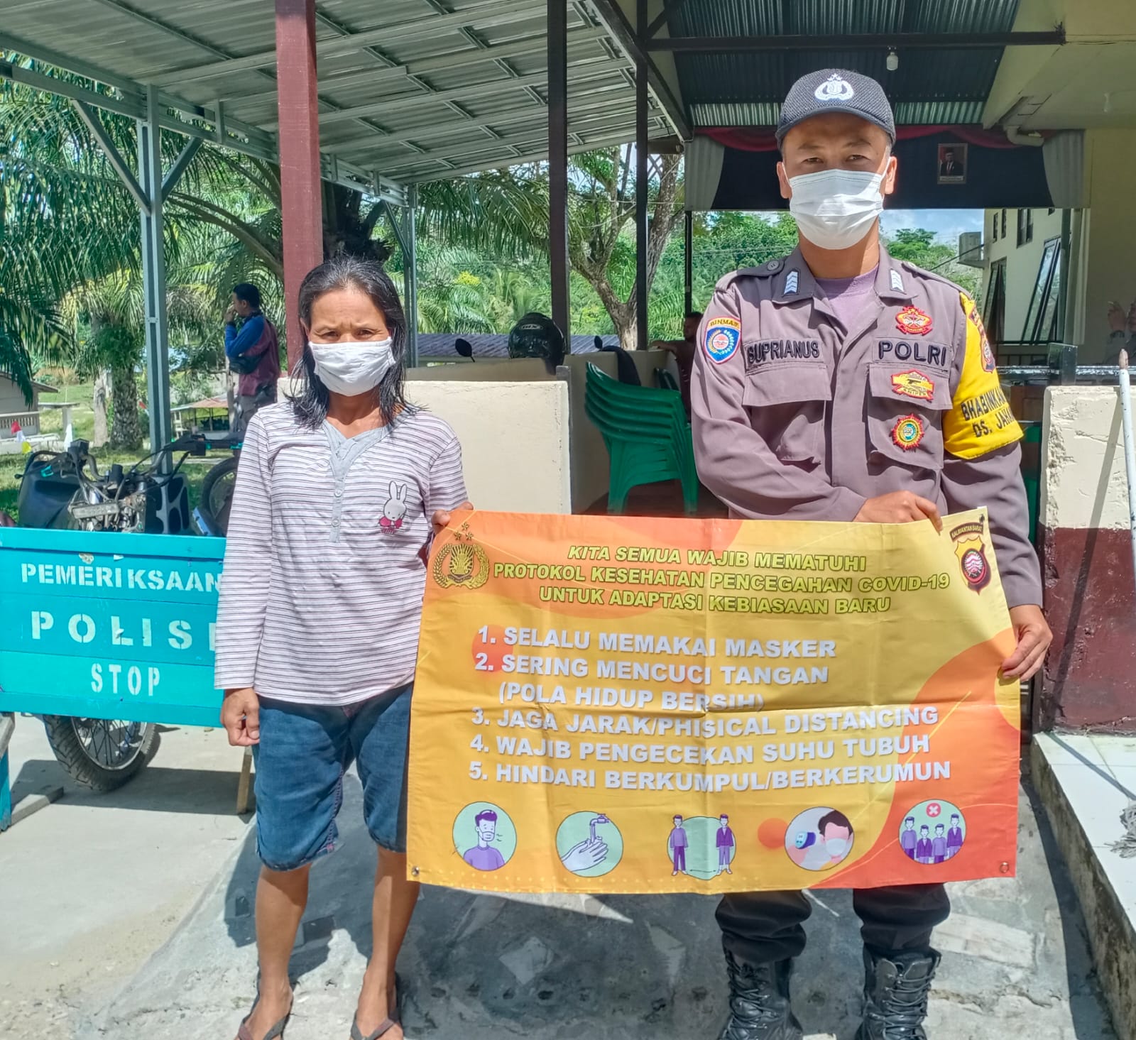 Dalam kegiatan ini, Bhabinkamtibmas Bripka Suprianus memberikan edukasi dan menyampaikan himbauan dengan media banner agar warga mudah memahami serta tetap waspada penyebaran virus Covid19 dengan selalu menerapkan Protokol Kesehatan 5 M.