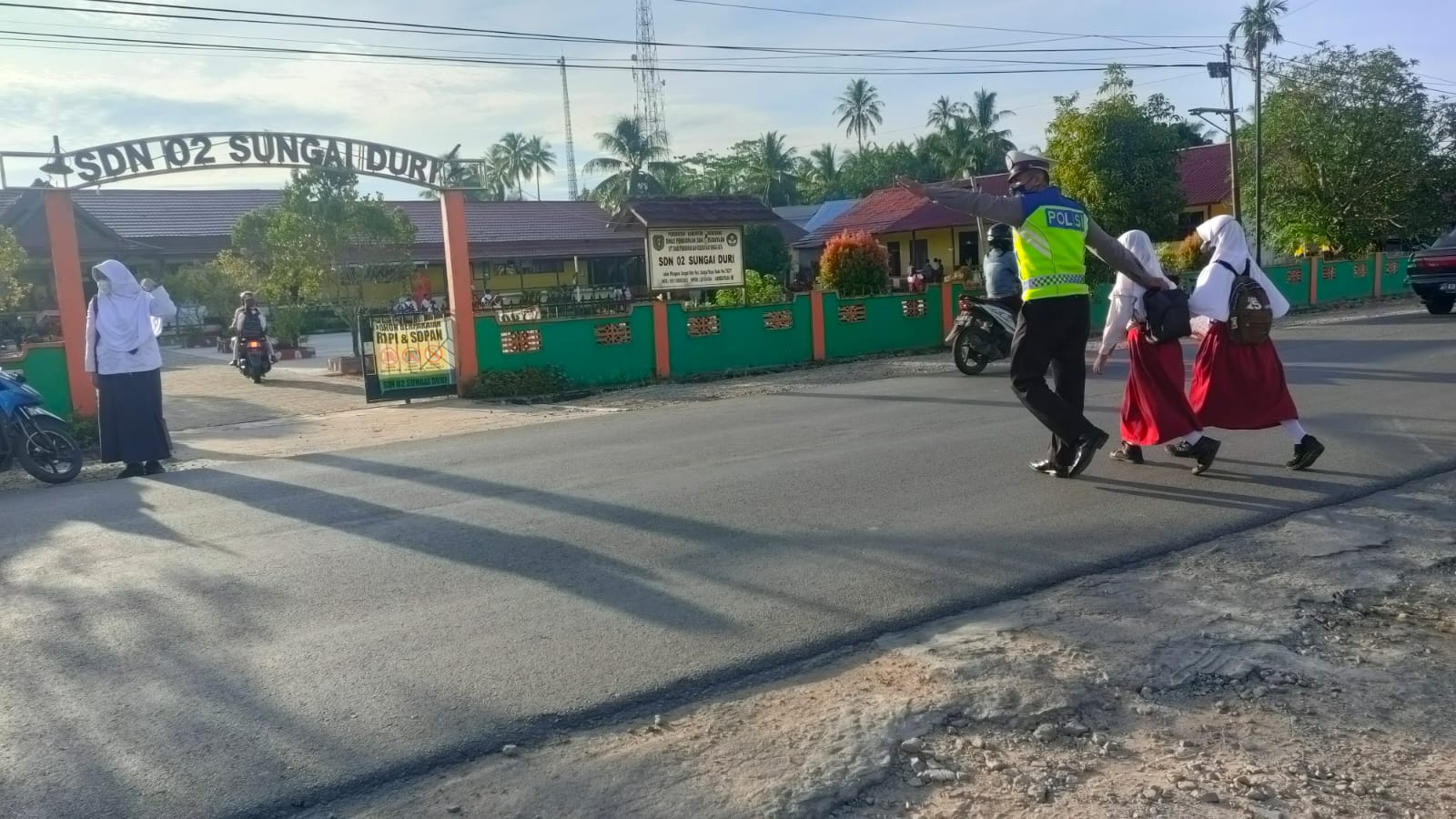 Untuk mengantisipasi terjadinya kemacetan lalu lintas pada pagi hari mulai pukul 06.15 Wib sampai dengan pukul 07.20 Wib, Personil Polsek Sungai Raya melaksanakan protap pagi berupa pengaturan arus lalu lintas.