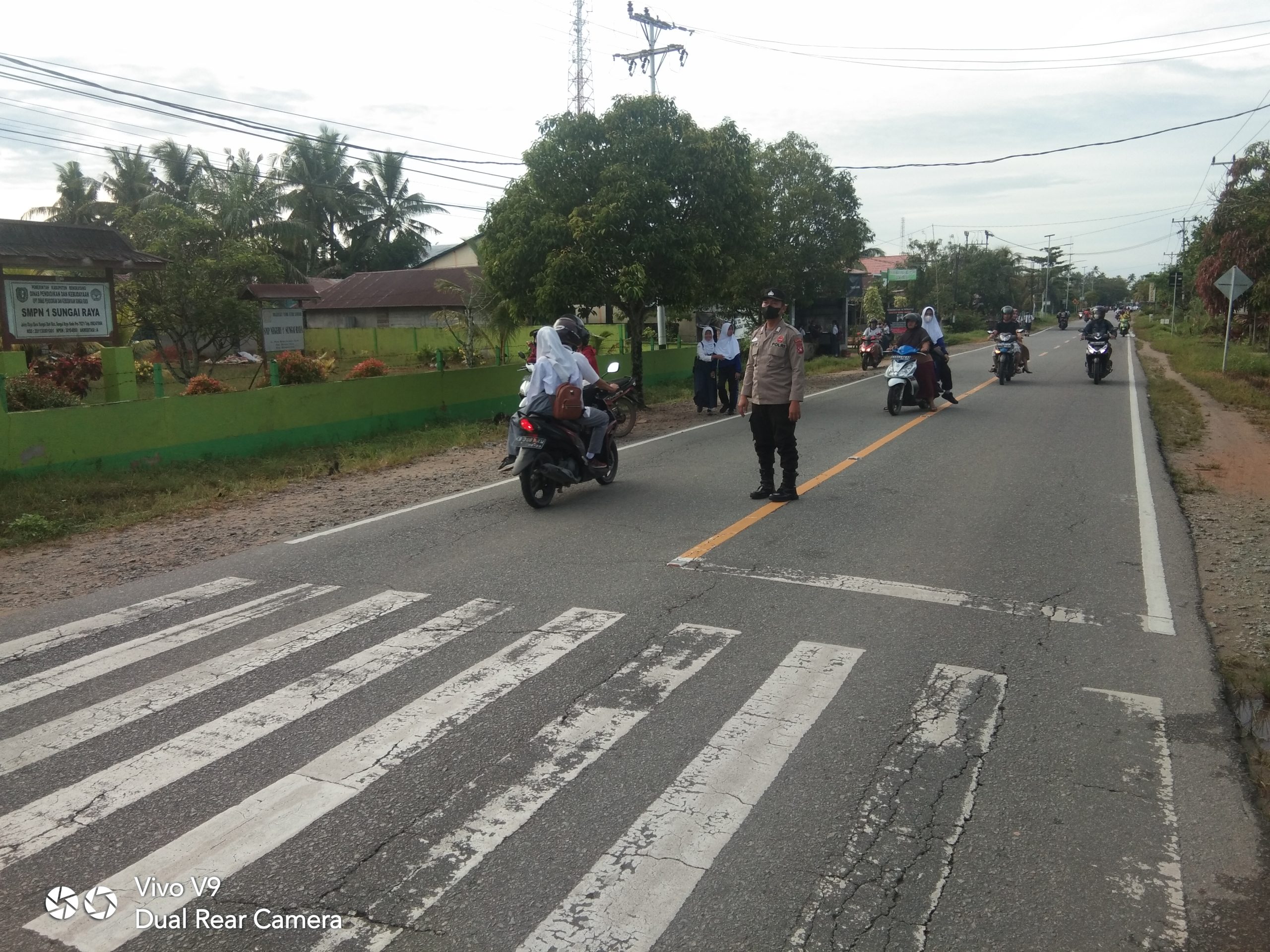 Untuk mengantisipasi terjadinya kemacetan lalu lintas pada pagi hari mulai pukul 06.15 Wib sampai dengan pukul 07.20 Wib, Personil Polsek Sungai Raya melaksanakan protap pagi berupa pengaturan arus lalu lintas.