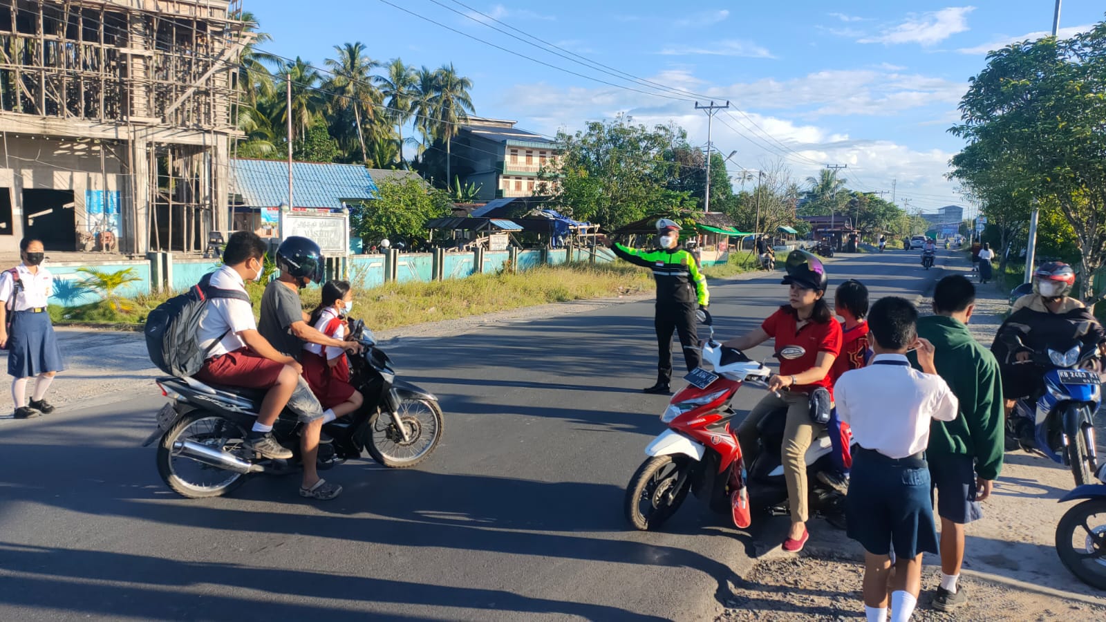 Untuk mengantisipasi terjadinya kemacetan lalu lintas pada pagi hari mulai pukul 06.15 Wib sampai dengan pukul 07.20 Wib, Personil Polsek Sungai Raya melaksanakan protap pagi berupa pengaturan arus lalu lintas.