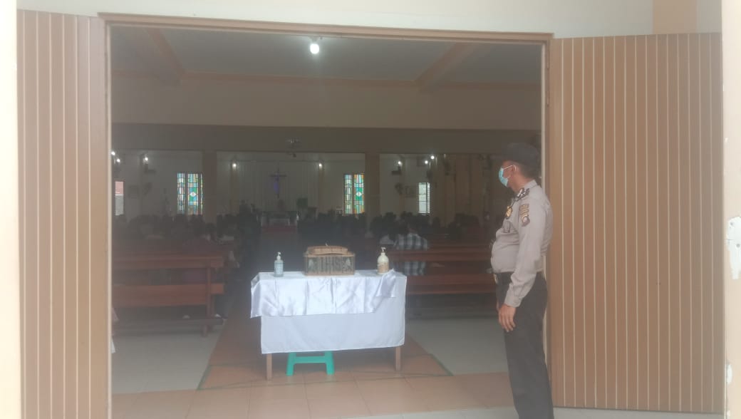 Anggota Polsek Bengkayang Polres Bengkayang dipimpin oleh Kanit SPK Polsek Bengkayang Aipda Zainudin pada hari Minggu tanggal 20 Juni 2021 pagi melaksanakan pengamanan Misa di gereja Santo Pius X Bengkayang di Kelurahan Bumi Emas kecamatan Bengkayang Kabupaten Bengkayang.