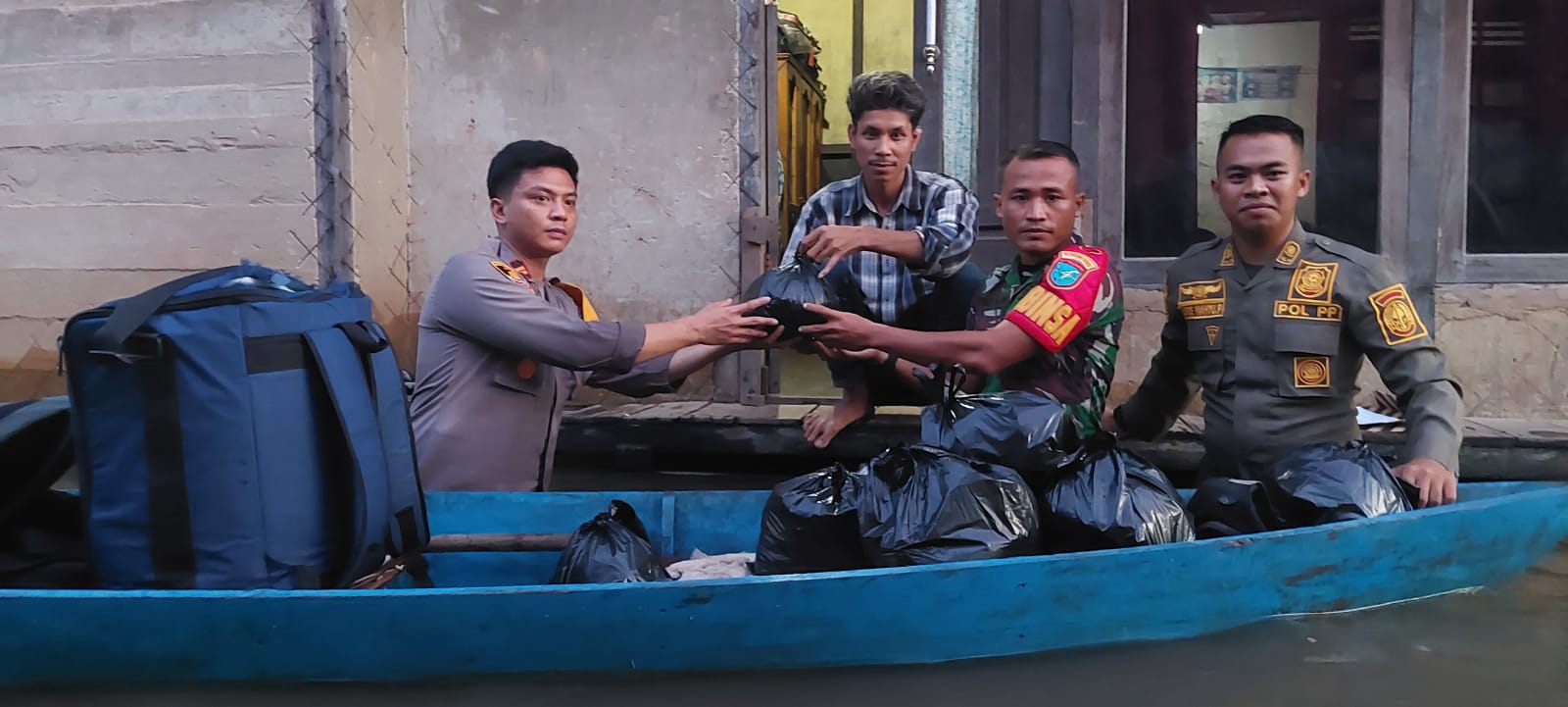 Tim gabungan terjun ke lokasi banjir dengan menggunakan perahu dan sampan untuk memberikan bantuan kepada warga desa yang bertahan di rumah, mengarungi genangan air dalam menyalurkan bantuan sembako untuk kebutuhan hidup sehari hari kepada warga yang bertahan di rumahnya dalam kondisi banjir tersebut.