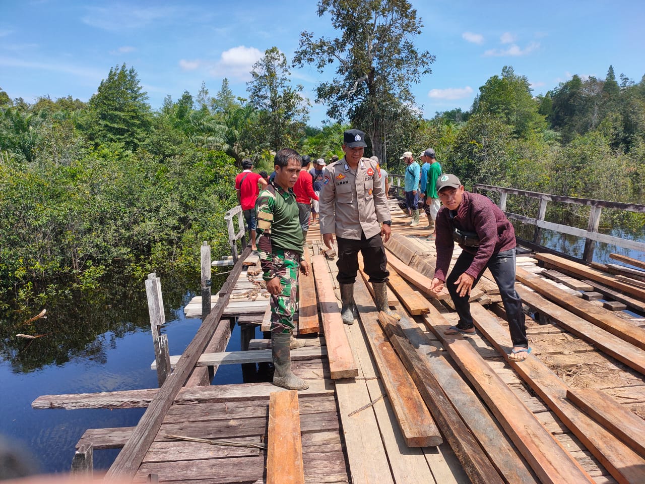 Sintang – Polsek Ketungau Hilir Polres Sintang Polda Kalbar, Personil Polsek Ketungau hilir Bripka Ilman dan Bhabinsa Desa Nanga Ketungau Serka Sunardi beserta masyarakat sekitar melakukan kegiatan gotong royong untuk memperbaiki jembatan Rambok yg rusak bertempat di Dusun Jemut Berlayar Desa Nanga Ketungau. Selasa (9/8/2022)