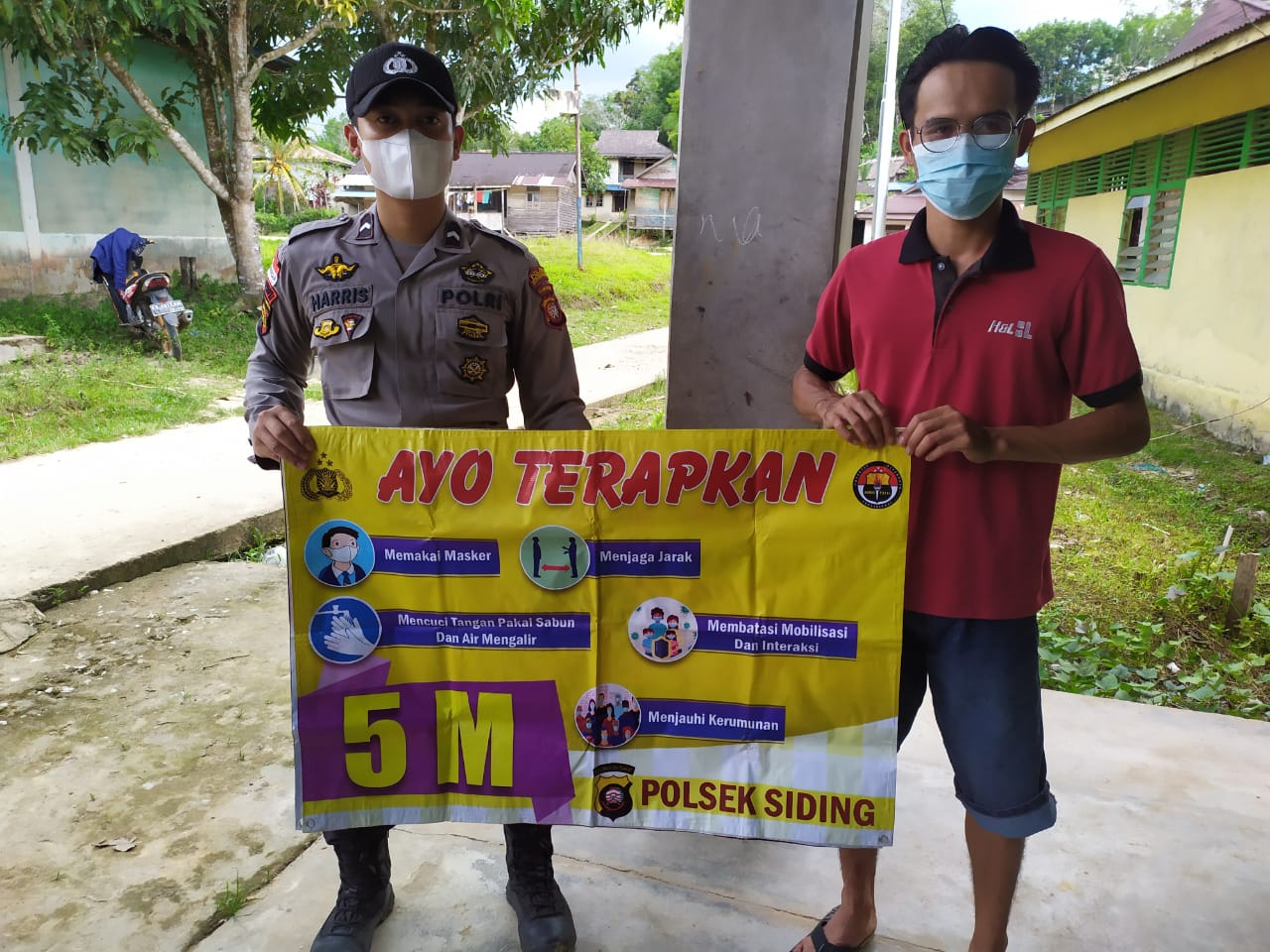 Dalam upaya untuk mendisiplinkan masyarakat terkait kepatuhan terhadap protokol kesehatan yang dikeluarkan oleh pemerintah, Personel Polsek Siding Bripda Dainel Harris tidak henti-hentinya menyambangi masyarakat untuk memberikan himbauan agar selalu menggunakan masker pada saat beraktivitas diluar rumah.