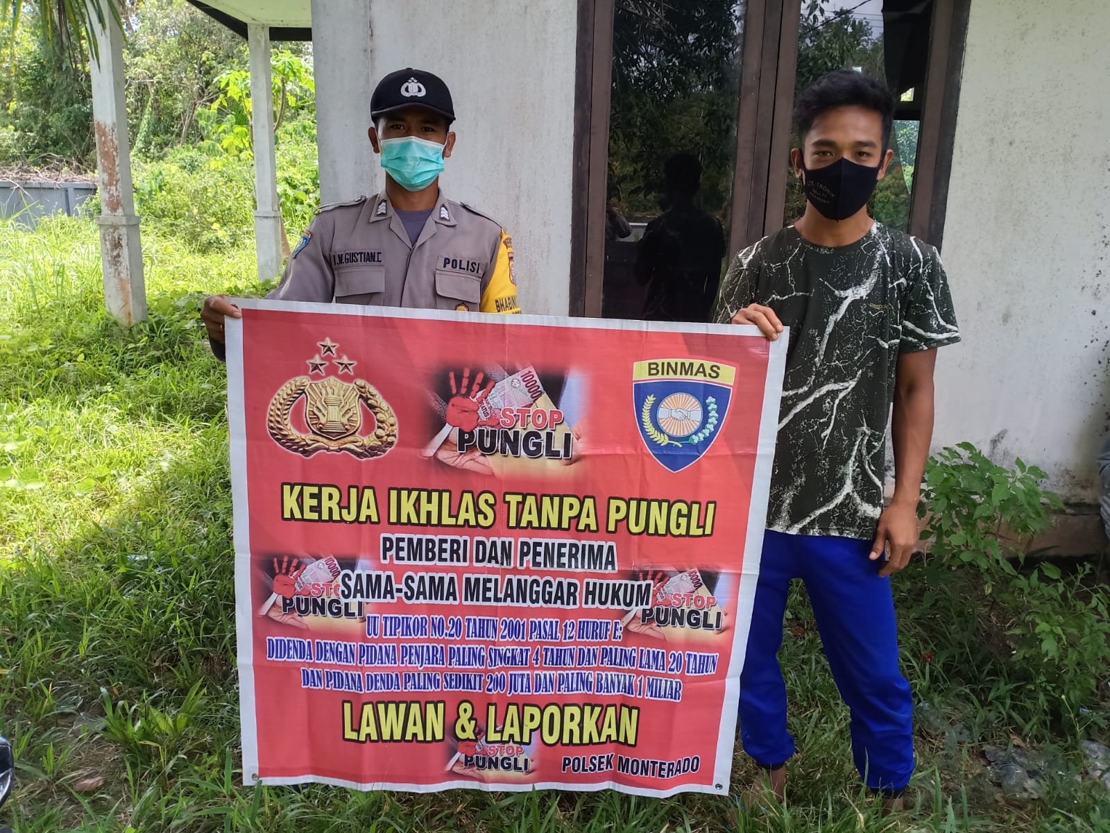 Polres Bengkayang, Polsek Monterado- Bhabinkamtibmas Polsek Monterado Brigpol Gustian bentangkan banner ke warga binaan untuk cegah dan laporkan Pungutan Liar (Pungli), Sabtu (08/11).