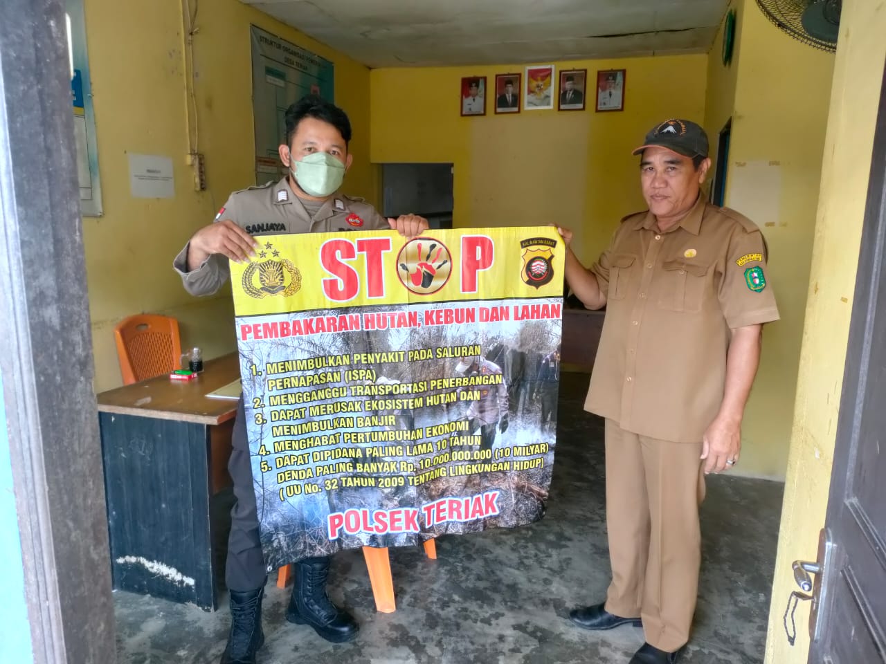 Polda kalbar, Polres Bengkayang, Polsek Teriak. Dengan adanya himbaun Pemerintah tentang bahaya karhutla maka kita patuhi bersama- sama agar tidak terdapat titik titik api di wilayah binaan. Bhabinkamtibmas yang bertugas di Desa Teriak Bripka Sanggra sebagai garda terdepan dan tidak henti hentinya memberikan pesan pesan kamtibmas dan menyampaikan himbuan baik melalui tapka, menggunakan banner dan melalui media sosial, agar supaya masyarakat tetap mematuhi himbauan pemerintah, Kamis 11/08/2022