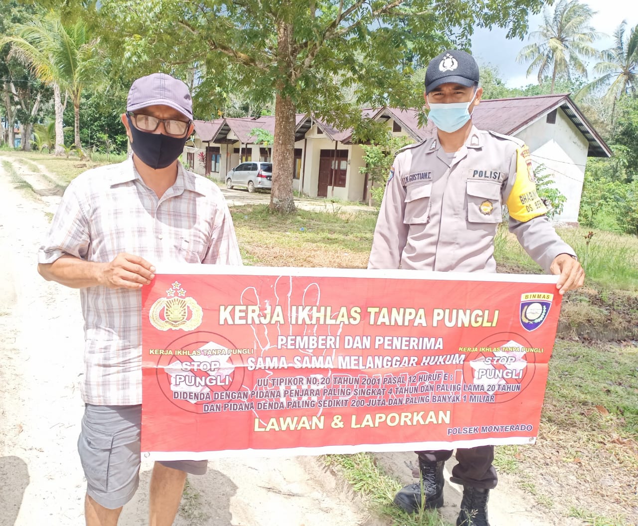 Dengan menggunakan banner kecil Brigadir Gustian menyampaikan himbauan Cegah Pungli agar mudah dipahami dan di sampaikan ke warga yang lainnya khususnya di Kecamatan Monterado.