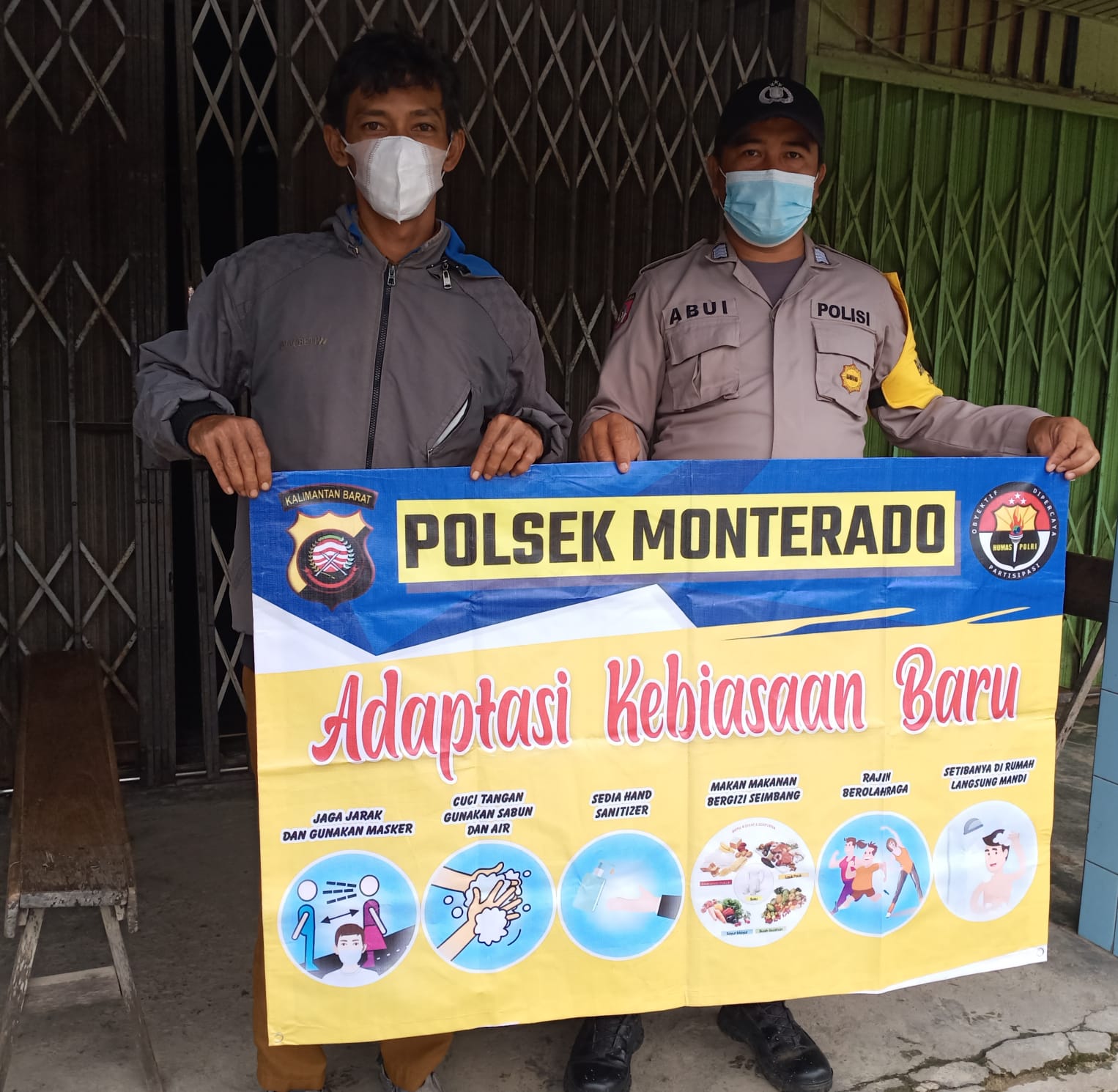 Tampak Bhabinkamtibmas Polsek Monterado Bripka Abui bersama warga binaan yang di jumpainya, menyampaikan edukasi sekaligus himbauan protokol kesehatan 5M dengan banner agar mudah dipahami warganya dalam mencegah penyebaran Covid-19.
