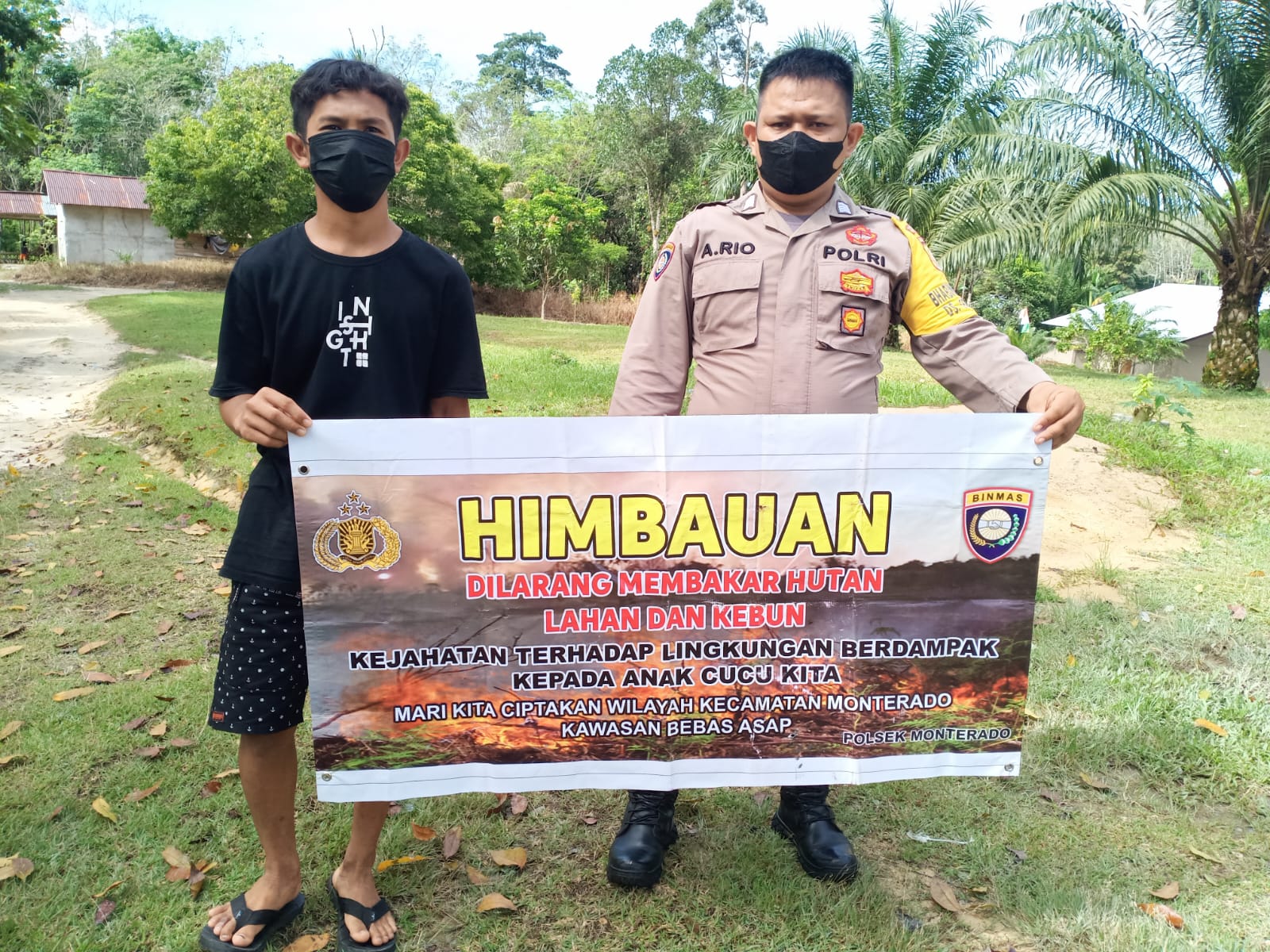 Himbauan cegah Karhutla disampaikan dengan humanis menggunakan banner Kecil, agar warga Kec. Monterado dapat memahami akibat dan sanksi hukum terhadap pembakar hutan serta lahan.