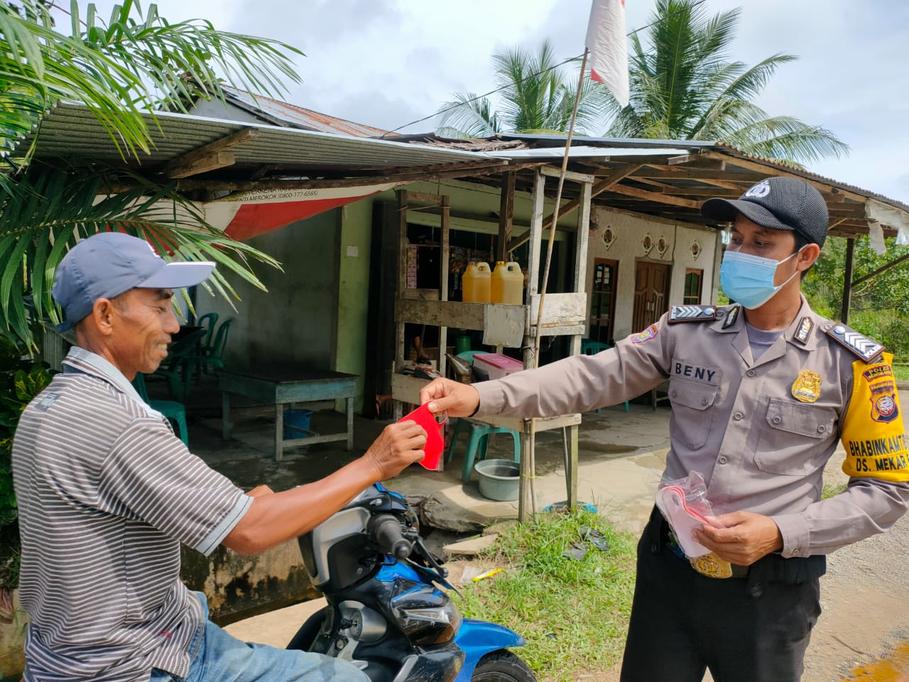Polres Bengkayang – Polsek Monterado. Bhabinkamtibmas Bripka Beni dalam rangka mencegah Covid19 membagikan masker gratis kepada masyarakat penguna jalan di wilayah Kec. Monterado, Sabtu (21/08).