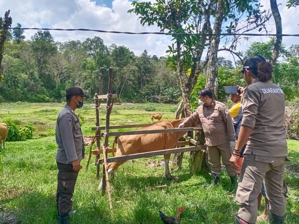 Polres Bengkayang – Bhabinkamtibmas Desa Jahandung Kecamatan Monterado Kabupaten Bengkayang Bripka Suprianus mendampingi Dinas perikanan dan kelautan bagian peternakan Kabupaten Bengkayang dan Dinas Karantina Pertanian Entikong melaksanakan vaksinasi PMK (Penyakit Mulut Dan Kuku) kepada hewan ternak di Desa Jahandung Kecamatan Monterado Kabupaten Bengkayang, Selasa (09/08/2022) Pagi.