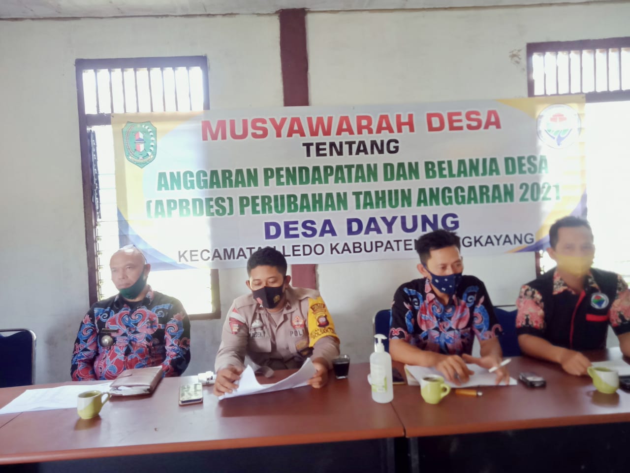 Bhabinkamtibmas Desa Dayung Kec. Ledo Briptu Tan Deden menghadiri kegiatan musyawarah desa (Musdes) yang dilaksanakan di Kantor Desa Dayung, Kamis (19/7/2021).