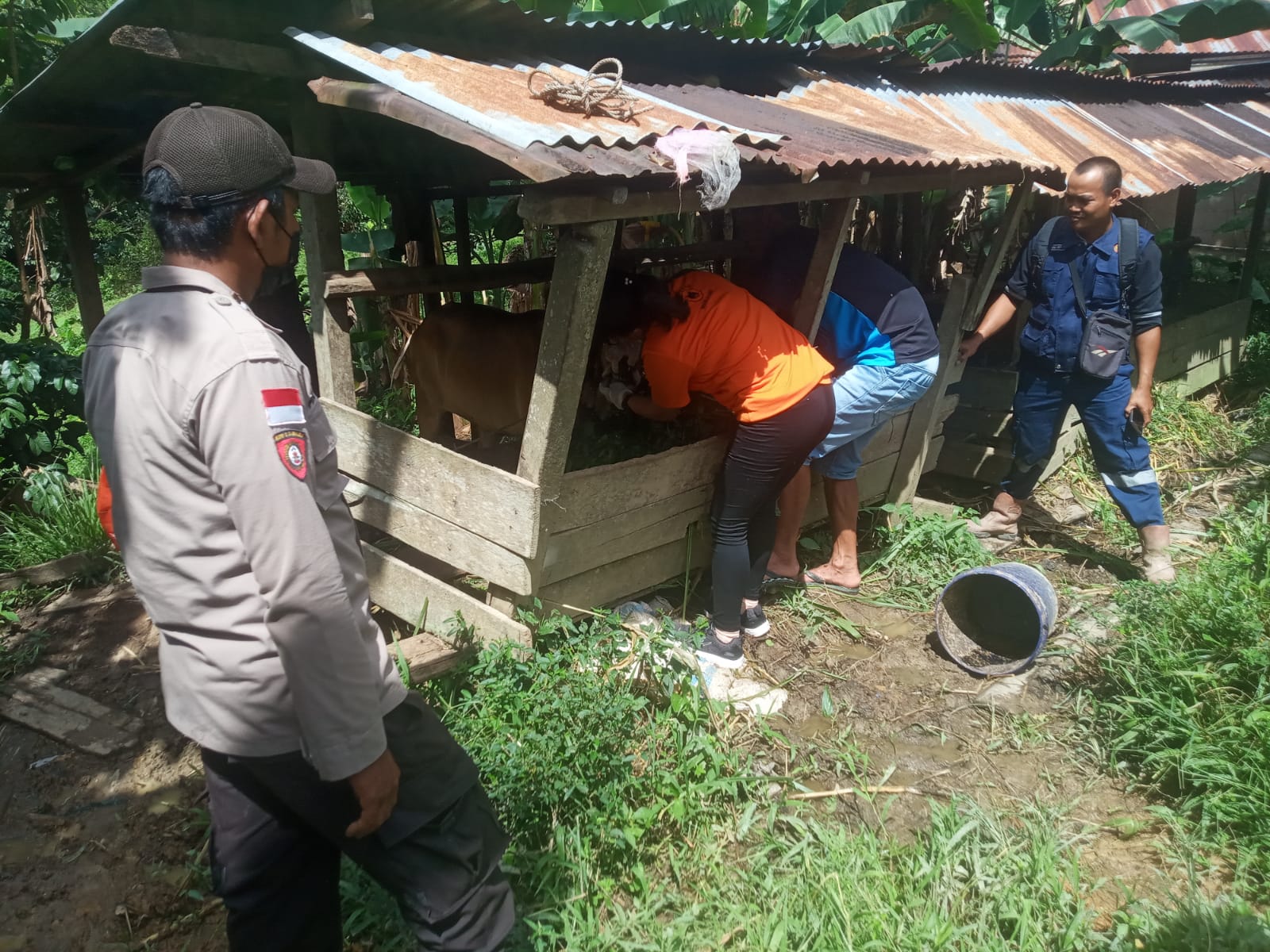 Untuk mencegah merebaknya penyakit PMK Bhabinkamtibmas Desa Lomba Karya Polsek Ledo Polres Bengkayang Polda Kalbar AIPDA Purwanto didampingi Kanit Intelkam AIPDA Honi Suryo dan petugas tim penyuluh PMK dan Rabies Dinas Kelautan dan Perikanan Kab. Bengkayang melaksanakan pengecekan dan mensosialisasikan penyakit mulut dan kaki (PMK) dan vaksinasi rabies kepada hewan ternak dan peliharaan milik warga Desa Lomba Karya Kec. Ledo. Rabu (22/6/2022).