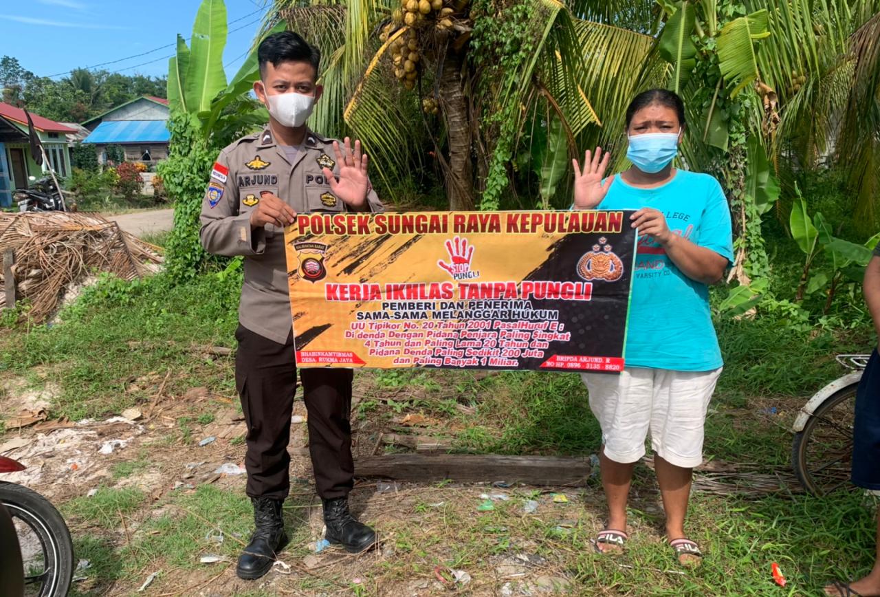Bhabinkamtibmas Desa Rukma Jaya Bripda Arjun Polsek sungai raya kepulauan sosialisasikan serta mengajak masyarakat Desa Rukma Jaya untuk berantas pungutan liar di Desa Rukma Jaya Selasa siang (10/08/2021).