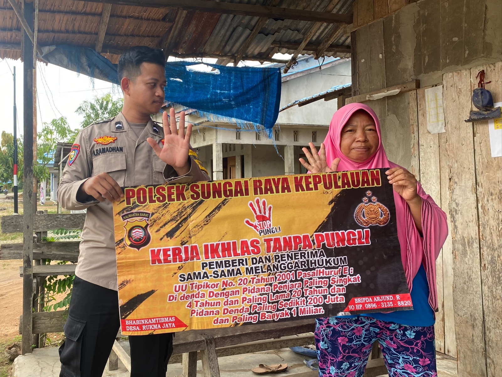 Bhabinkamtibmas Desa Rukma Jaya Bripda Arjun Polsek sungai raya kepulauan Polres Bengkayang Polda Kalbar sosialisasikan serta mengajak masyarakat Desa Rukma Jaya untuk berantas pungutan liar di Desa Rukma Jaya Selasa siang (10/01/2023).