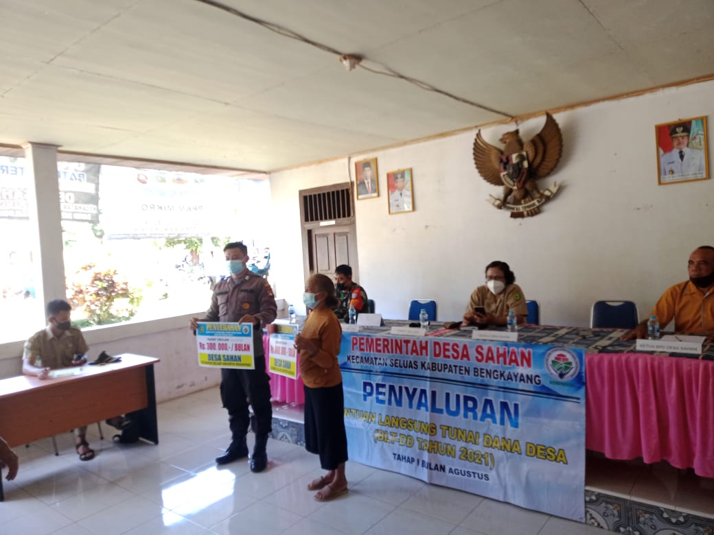 Polres Bengkayang – Bertempat di Aula Kantor Desa Sahan Bhabinkamtibmas Desa Sahan Brigadir Agus Srinaldi bersama Muspika menghadiri penyerahan BLT Dana Desa Tahap I Bulan ke VIII tahun 2021 kepada warga Desa Sahan. Selasa (24/08/2021)