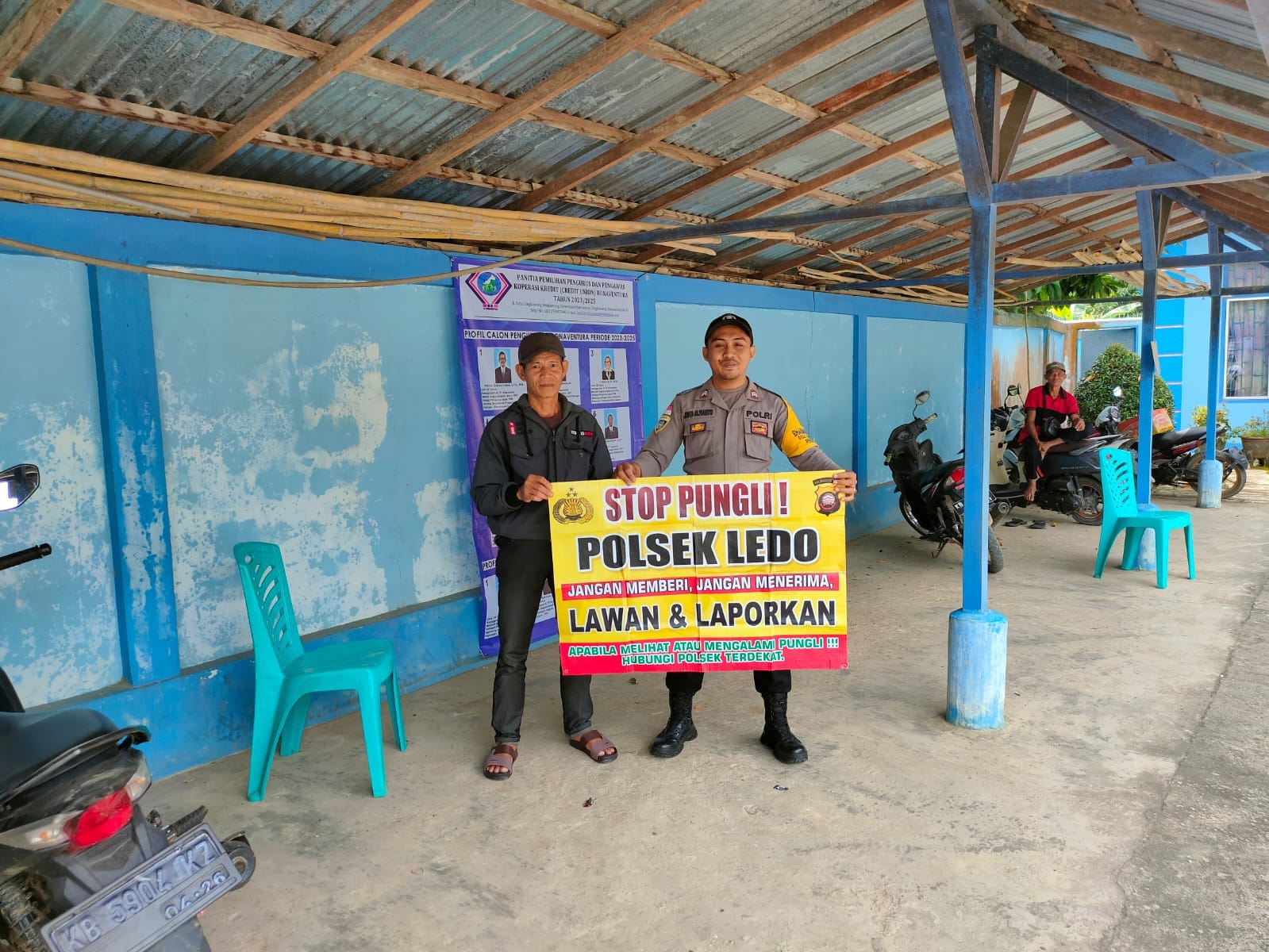 Tribratanews.polri.go.id – Bhabinkamtibmas Desa Tebuah Marong Polsek Ledo Briptu Joko Alfianto Saputra mengkampanyekan banner Stop Pungli kepada Masyarakat.
