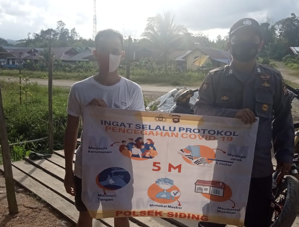 Salah satu Kegiatan Rutin yang ditingkatkan dan dilaksanakan oleh Polsek Siding Polres Bengkayang Polda Kalbar adalah penyampaian Edukasi dan Himbauan serta Pembagian masker.