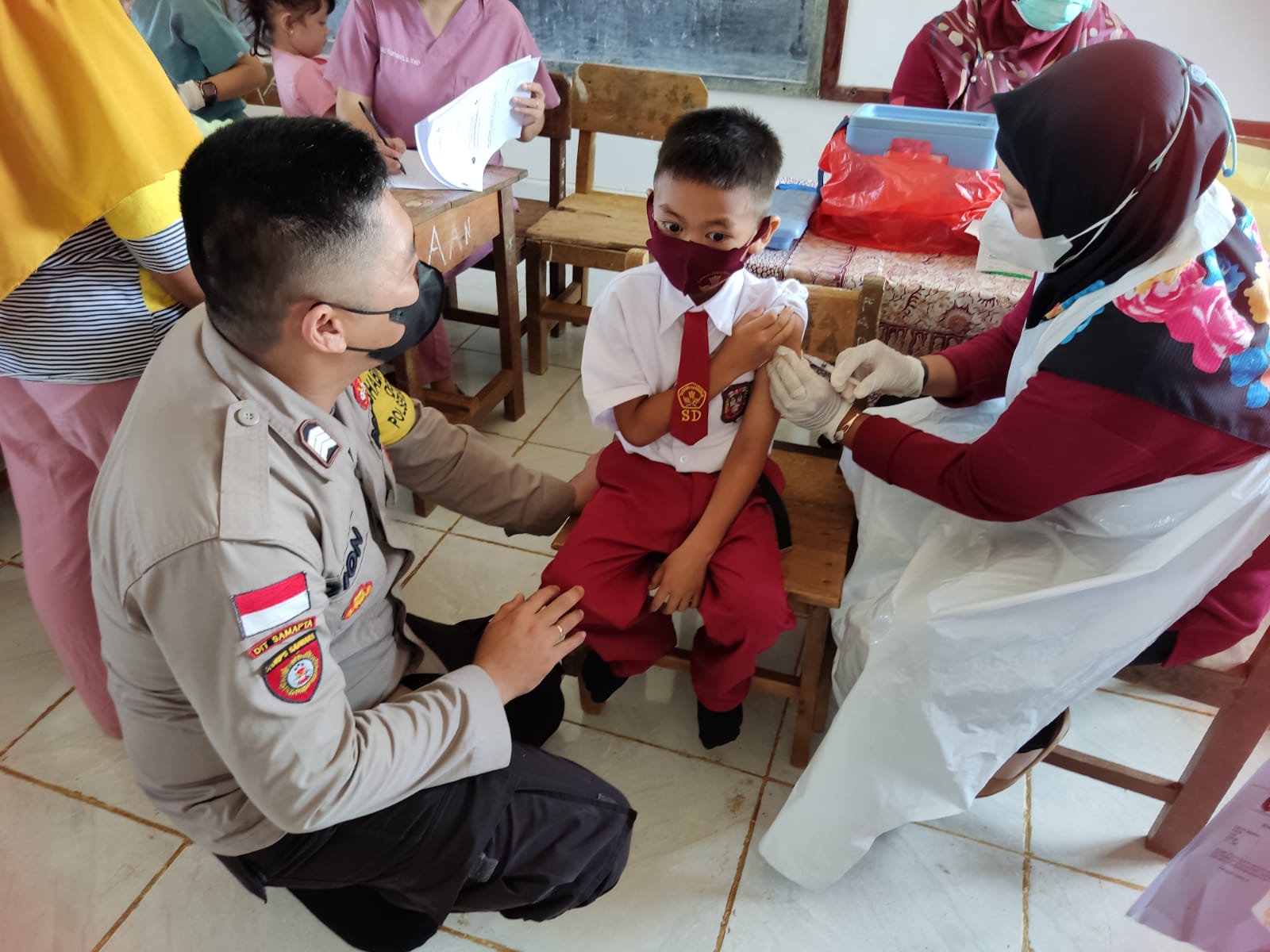 Polsek Sanggau Ledo, Polres Bengkayang, Polda Kalimantan Barat, Brigadir Dionisius melaksanakan monitoring dan pengamanan Vaksinasi usia 6-11 tahun, Kamis 17 Februari 2022