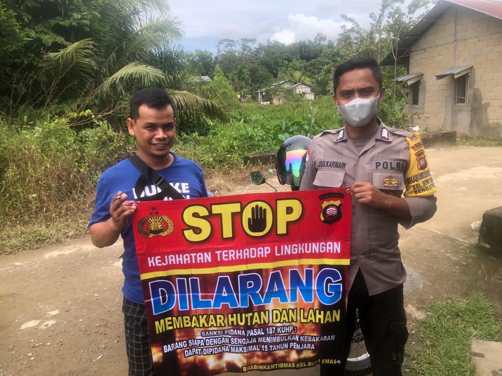 Peran Bhabinkamtibmas bersama warganya sosialisasi dan membentangkan banner, sekaligus menghimbau warga tidak melakukan pembakaran hutan dan lahan.