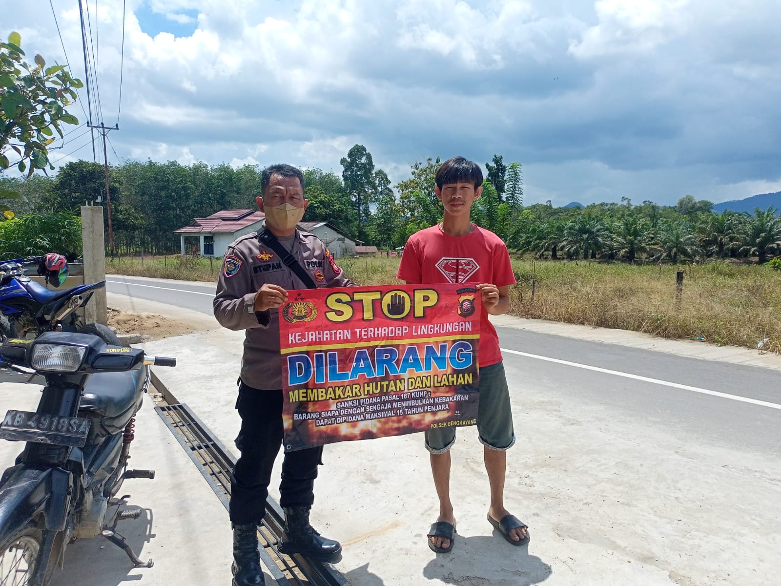 Peran Bhabinkamtibmas bersama warganya sosialisasi dan membentangkan banner, sekaligus menghimbau warga tidak melakukan pembakaran hutan dan lahan.