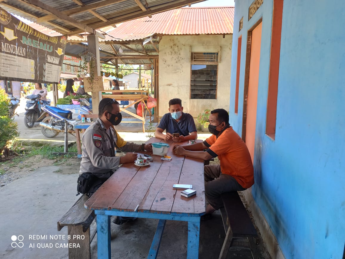 Bhabinkamtibmas Desa Monterado Bripka Pepel sambangi dan memberikan imbauan protokol kesehatan 5M kepada warga yang nongkrong di warkop Sdr. Nursidin dengan melakukan tatap muka, Minggu(13/06/2021).