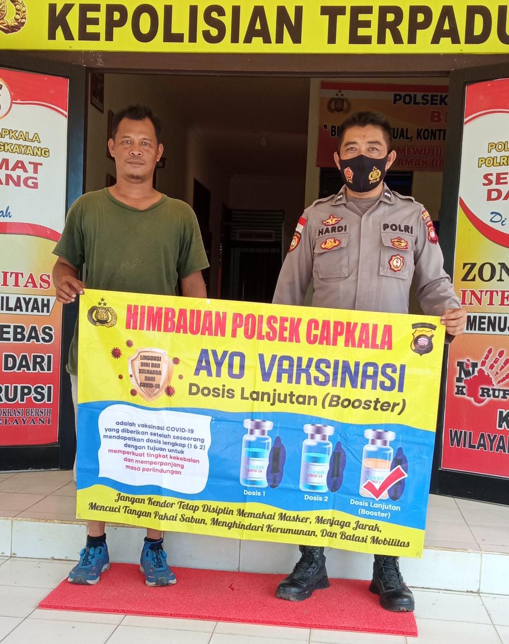 Lewat kegiatan tersebut, Kapolsek Capkala IPDA Hasan Abdullah, S.H., M.H. melalui Kanit Binmas Bripka Nanang S. menyampaikan bahwa petugas melakukan himbauan dan sosialisasi kepada warga untuk mengajak agar melaksanakan vaksinasi dosis 1, 2 maupun booster di Puskesmas Capkala atau gerai Vaksinasi Polsek Capkala.