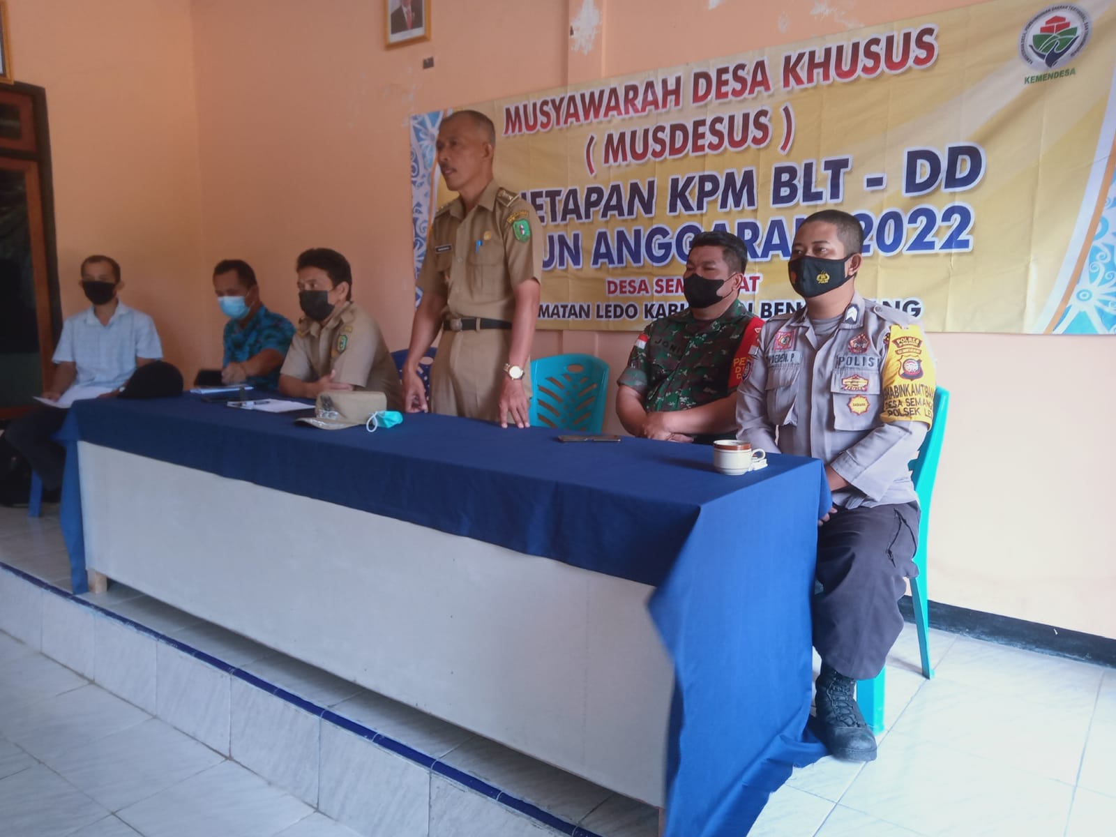 Bhabinkamtibmas Desa Semangat Briptu Tan Deden hadiri undangan kegiatan Musyawarah Desa Khusus Desa Semangat dalam rangka validasi, finalisasi dan penetapan calon penerima Bantuan Langsung Tunai Desa Semangat tahun anggaran 2022. Senin (31/1/2022).