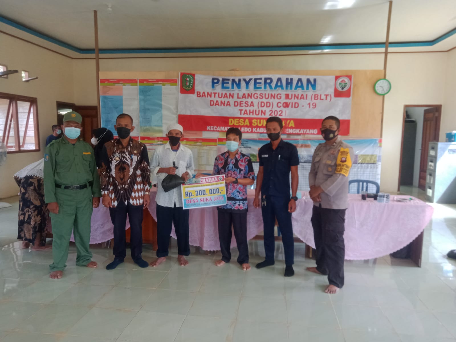 Briptu Tan Deden Bhabinkamtibmas Desa Suka Jaya Kecamatan Ledo Kabupaten Bengkayang mengatakan, Kepala desa membagikan BLT DD tahun 2021 Bulan Oktober sebesar Rp.300.000 tiga ratus ribu kepada warga kurang mampu yang terkena dampak dari wabah covid-19 yang tidak menerima PKH dan Bantuan sembako ucapnya.