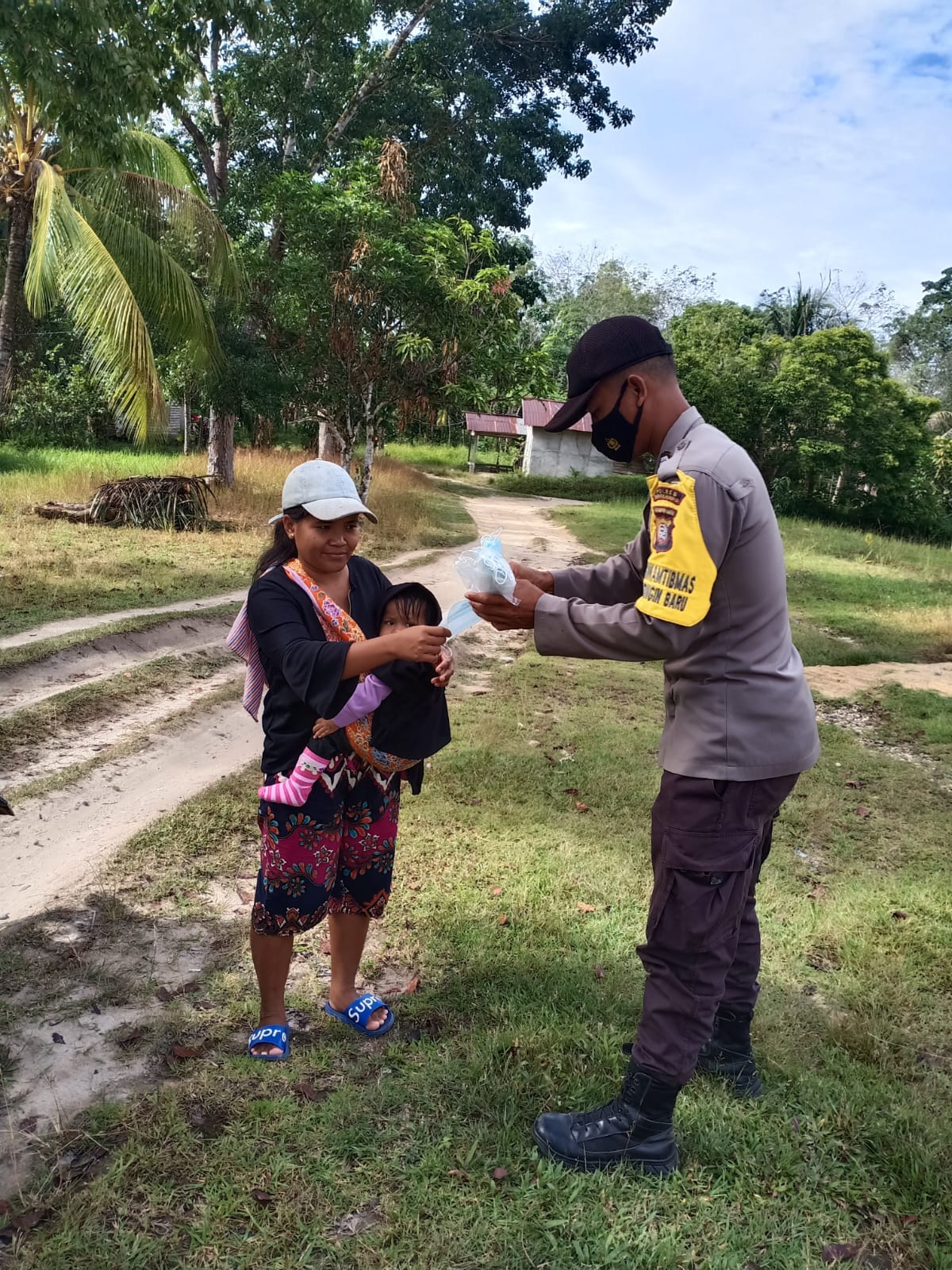 Bhabinkamtibmas Polsek Monterado Brigadir Gustian memberikan masker gratis secara langsung ke warga yang di jumpainya.