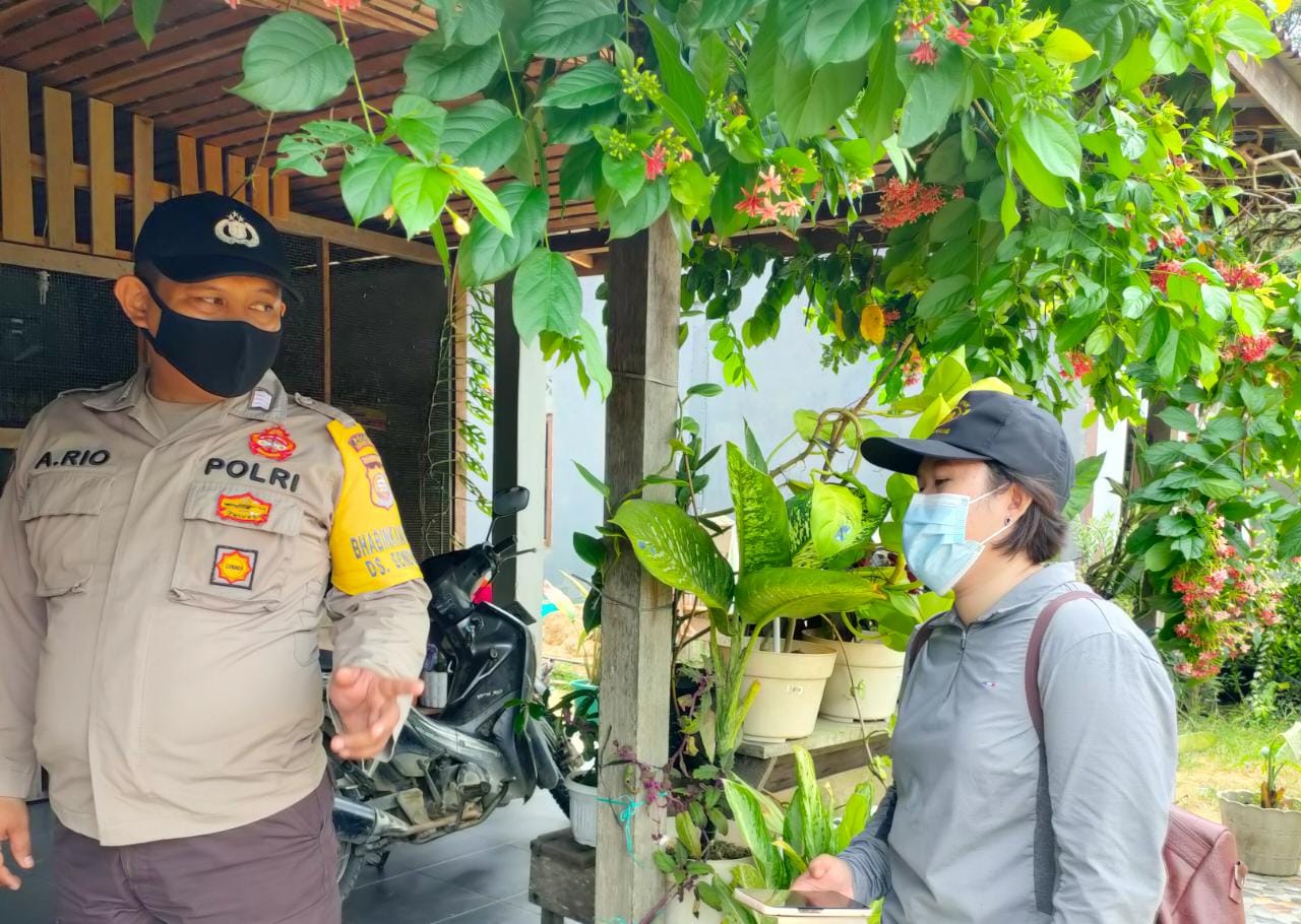 Bhabinkamtibmas Polsek Monterado Brigadir Albertus Rio dengan humanis memberikan himbuan agar warga selalu menerapkan Protokol Kesehatan 5M saat beraktivitas di luar rumah, Senin(01/11/2021).