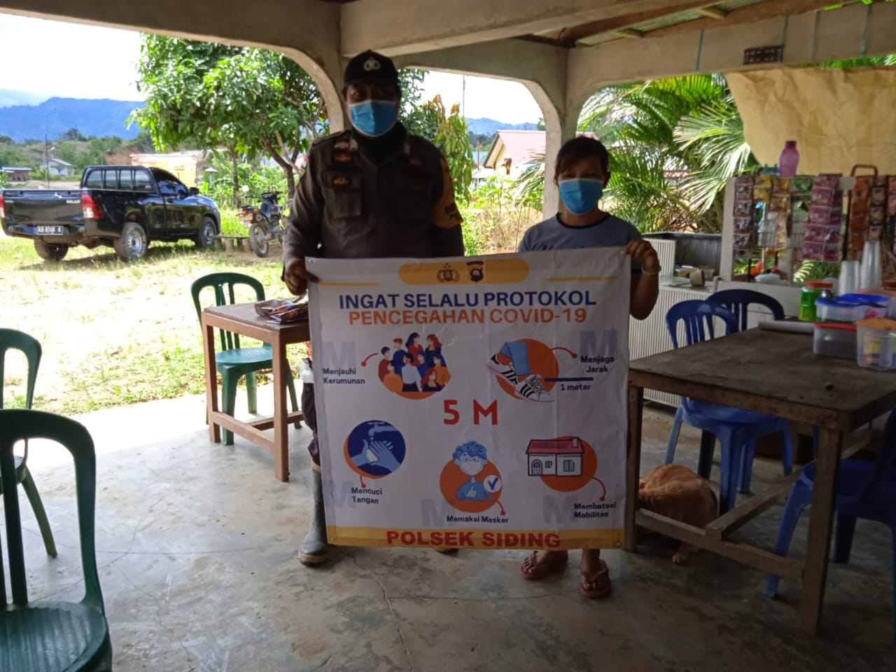 Pada kunjungan di salah satu pemilik warung sembako di dusun Sebujit Baru desa Hli Buei kecamatan Siding kabupaten Bengkayang, Bripka Dwi Suharto menyampaikan kepada pemilik warung tersebut,”Sandi”,”konsisten dalam penerapan Prokes, seperti penyediaan air cuci tangan mengalir, Sabun cuci tangan, Penggunaan Masker, hal ini semata-mata untuk perlindungan kita bersama dari menekan penyebaran virus Covid-19,”ucapnya”.