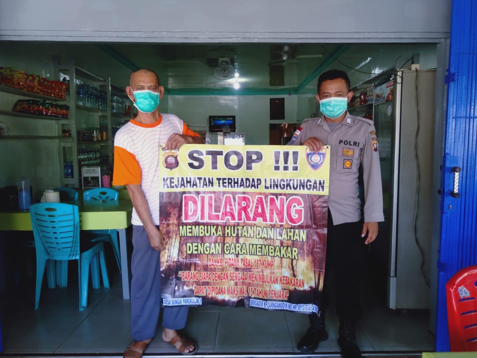 Himbaun berupa Bener tersebut bertulisan Stop kejahatan terhadap lingkungan, Dilarang membuka lahan dan hutan dengan cara membakar dengan saksi pidana pasal 187 KUHP.