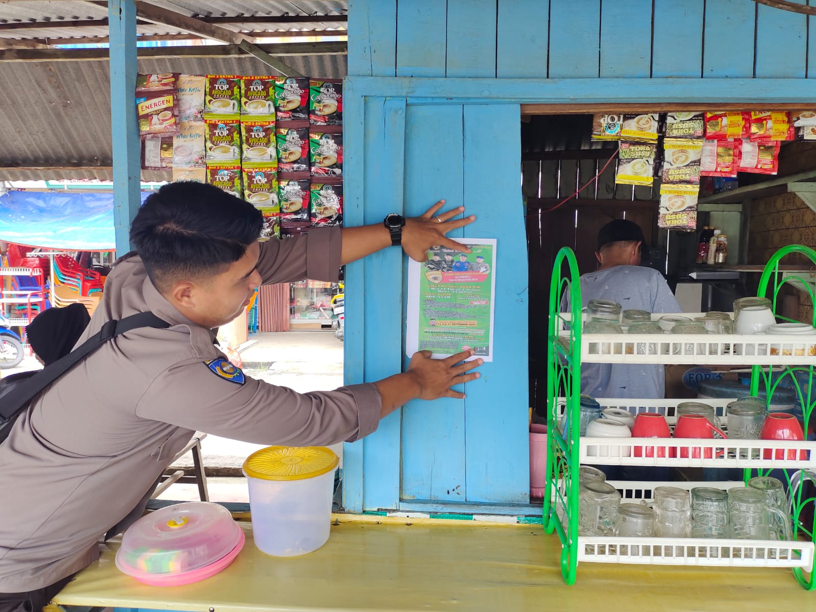 Polsek Sungai Raya Polres Bengkayang Polda Kalimantan Barat, Bhabinkamtibmas Polsek Sungai Raya memasang Pamflet penerimaan Polri ditempat umum, maupun di warung-warung Kecamatan Sungai Raya Kabupaten Bengkayang, guna menjaring dan meningkatkan animo masyarakat yang maksimal.