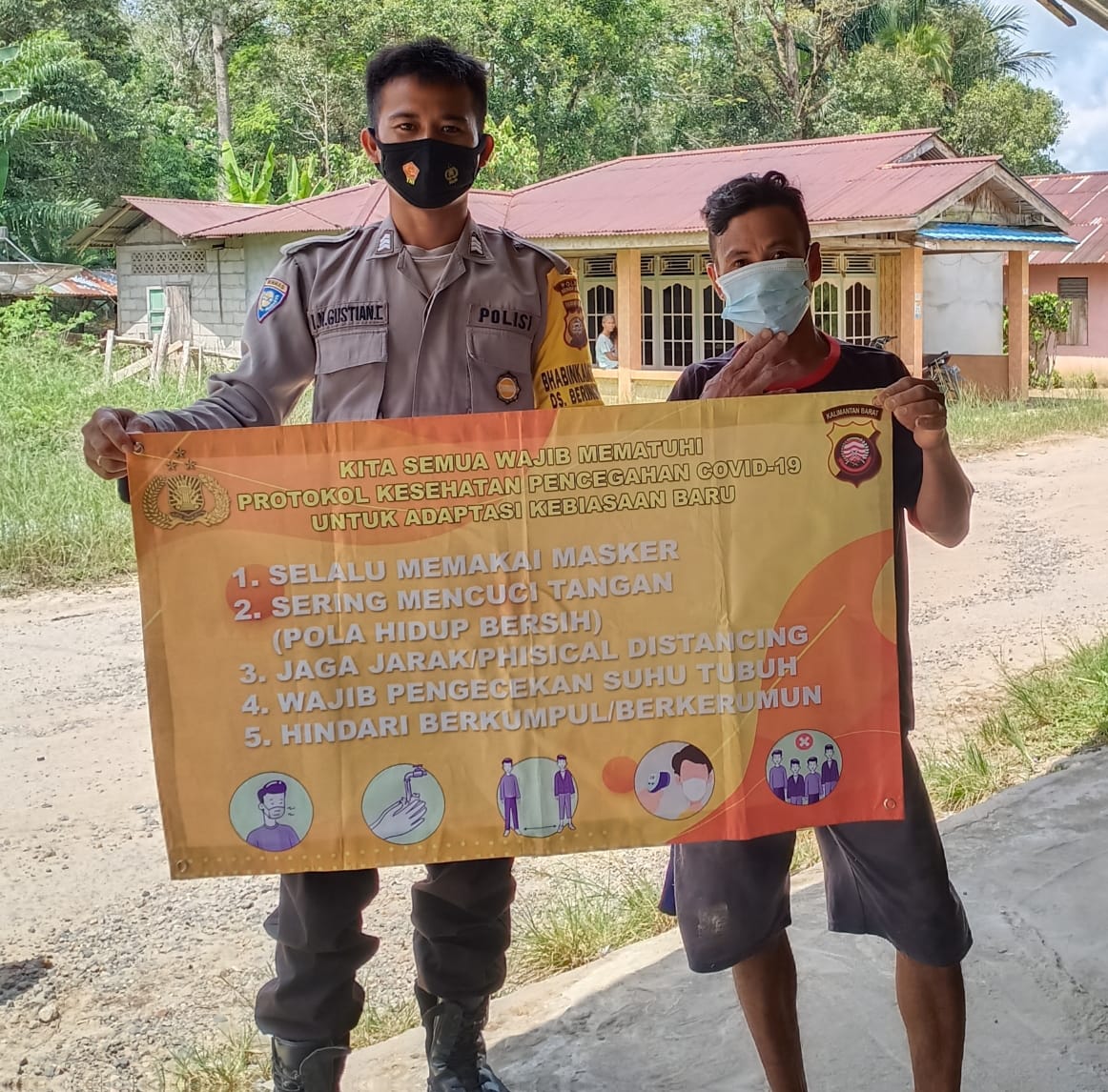 Polres Bengkayang, Polsek Monterado- Bhabinkamtibmas Polsek Monterado Brigadir I.Nyoman Gustian rutin sampaikan himbauan Protokol Kesehatan dengan banner 5M kepada warga masyarakat Kec. Monterado, Senin (7/6/2021).