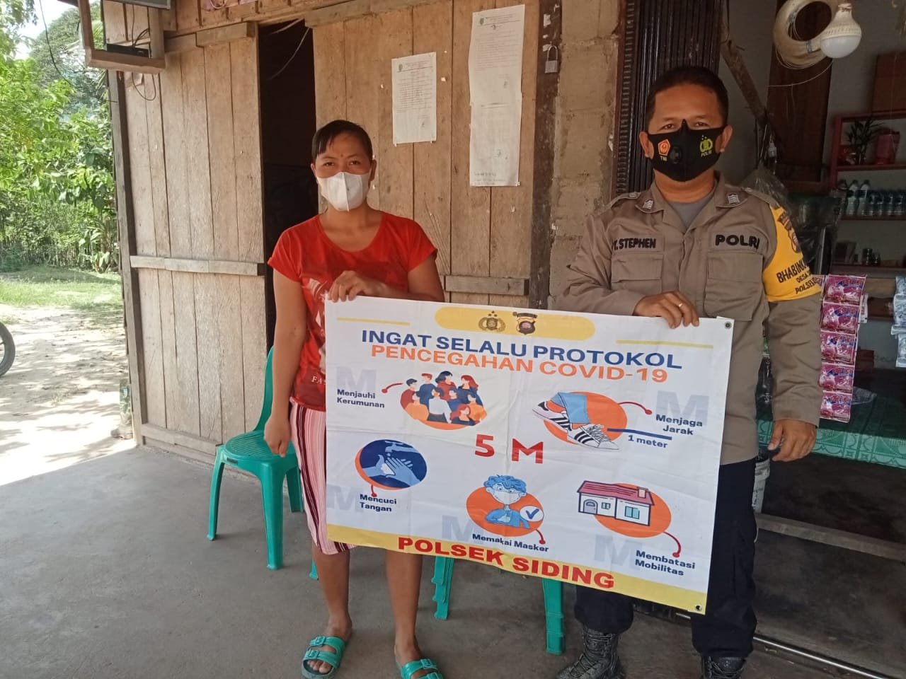 Polsek Siding Polres Bengkayang Polda Kalbar hari ini kembali melakukan himbauan protokol kesehatan kepada warga yang berada di pemukiman Wilayah Kecamatan Siding Kabupaten Bengkayang sebagai upaya mencegah penyebaran Covid-19, Kamis (21/04/2022).