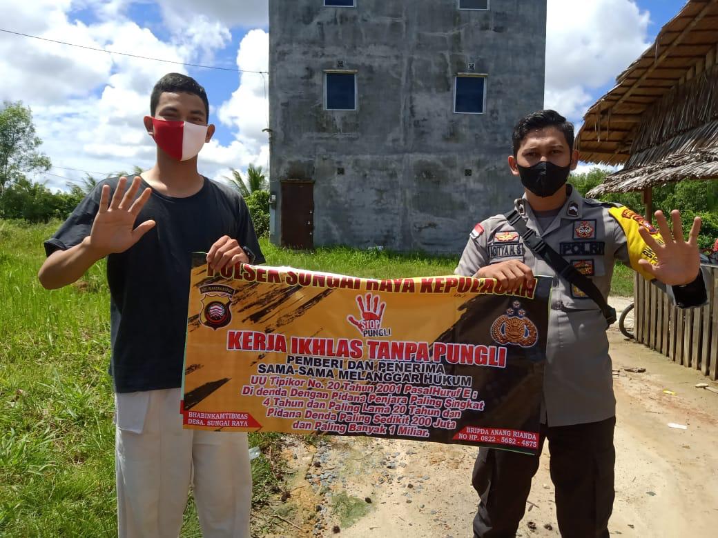 Bripda Aditya ketika melakukan menyampaikan himbauan Saber pungli dengan menggunakan alat peraga banner bertuliskan stop pungli bersama Warga Desa Karimunting ,kecamatan Sungai Raya Kepulaun,Jumat Siang (03/09/2021).