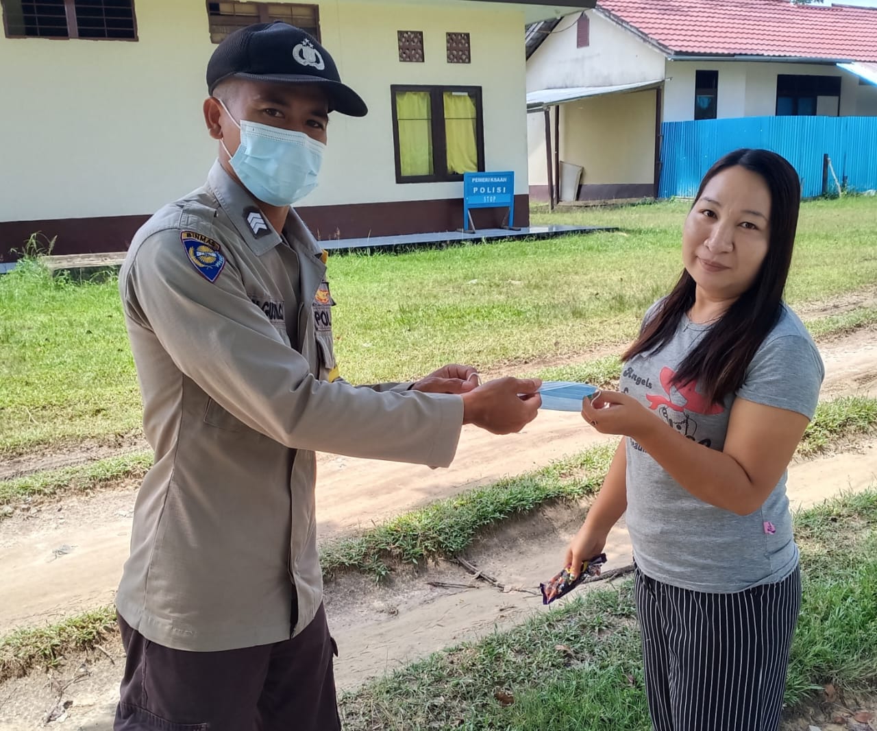 Polres Bengkayang – Polsek Monterado. Brigadir Gustian dalam rangka mencegah Covid19 memberikan masker gratis kepada masyarakat Desa Monterado Kec. Monterado, Minggu(24/10).