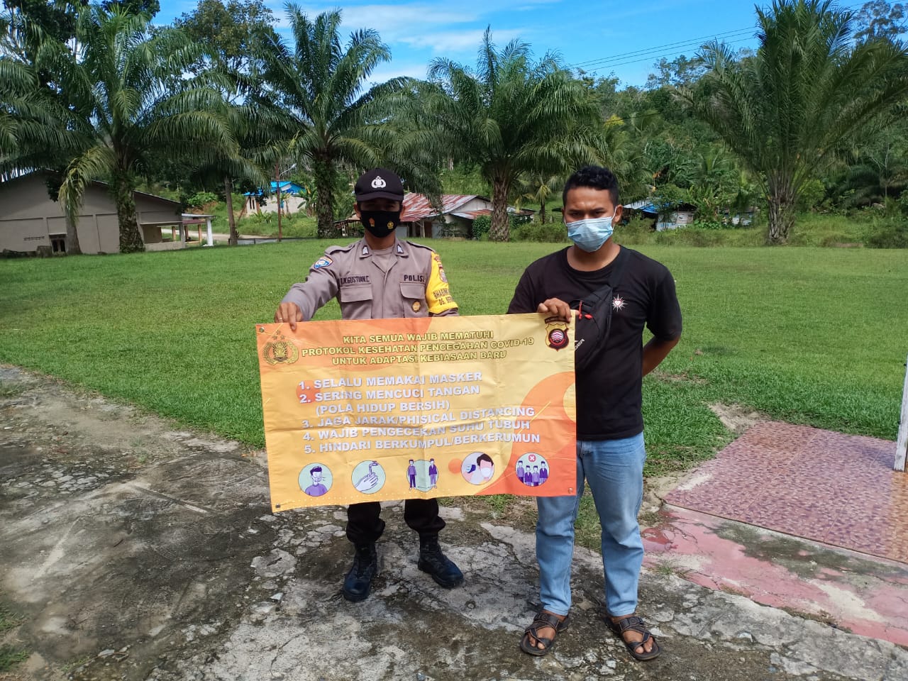 Brigadir I.Nyoman Gustian mengimbau dan mengingatkan warga agar menerapkan protokol kesehatan dengan menggunakan banner 5M yaitu memakai masker, menjaga jarak, mencuci tangan, mengurangi mobilitas dan menghindari kerumunan.